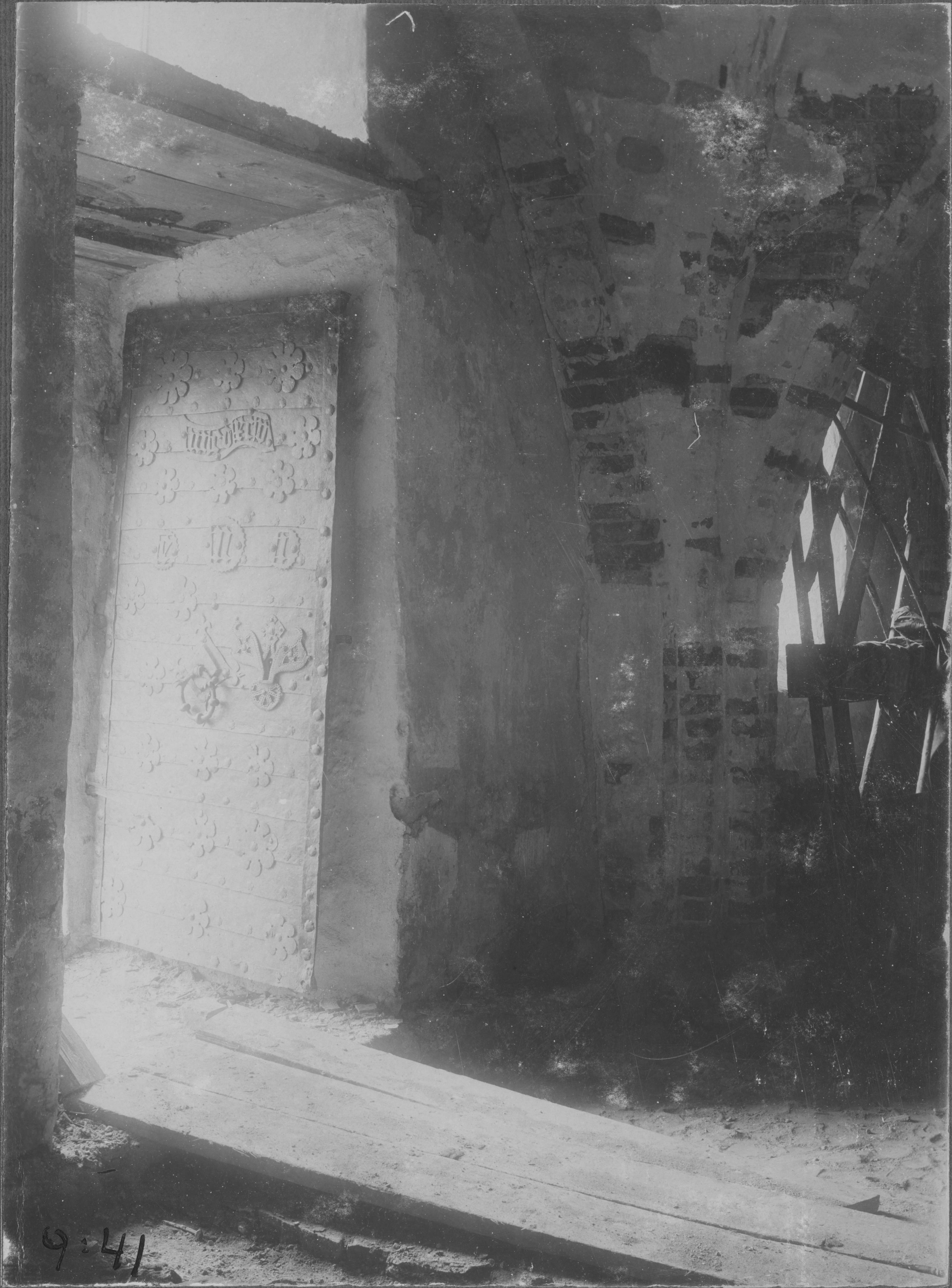 Beskrivning: Södra väggen. Sydporten, järndörr rikt bemålad i rött, grönt, gult samt med förtennade detaljer. Kyrkans ursprungliga port.