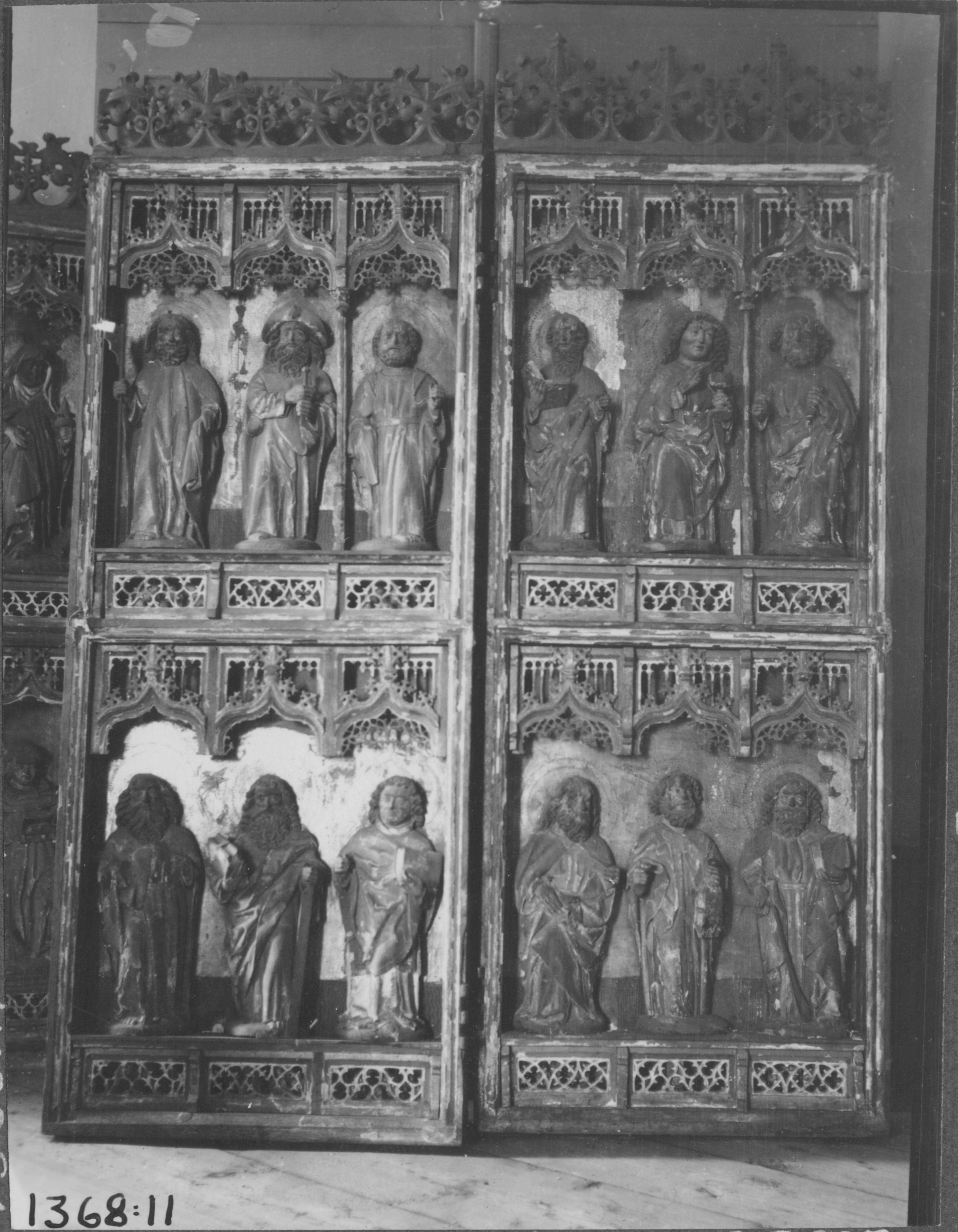 Beskrivning: Altarskåp av ek. Detalj, dörrarna med vardera sex apostlar. Över- och understycken med masverk och rankor. Omkring 1500.