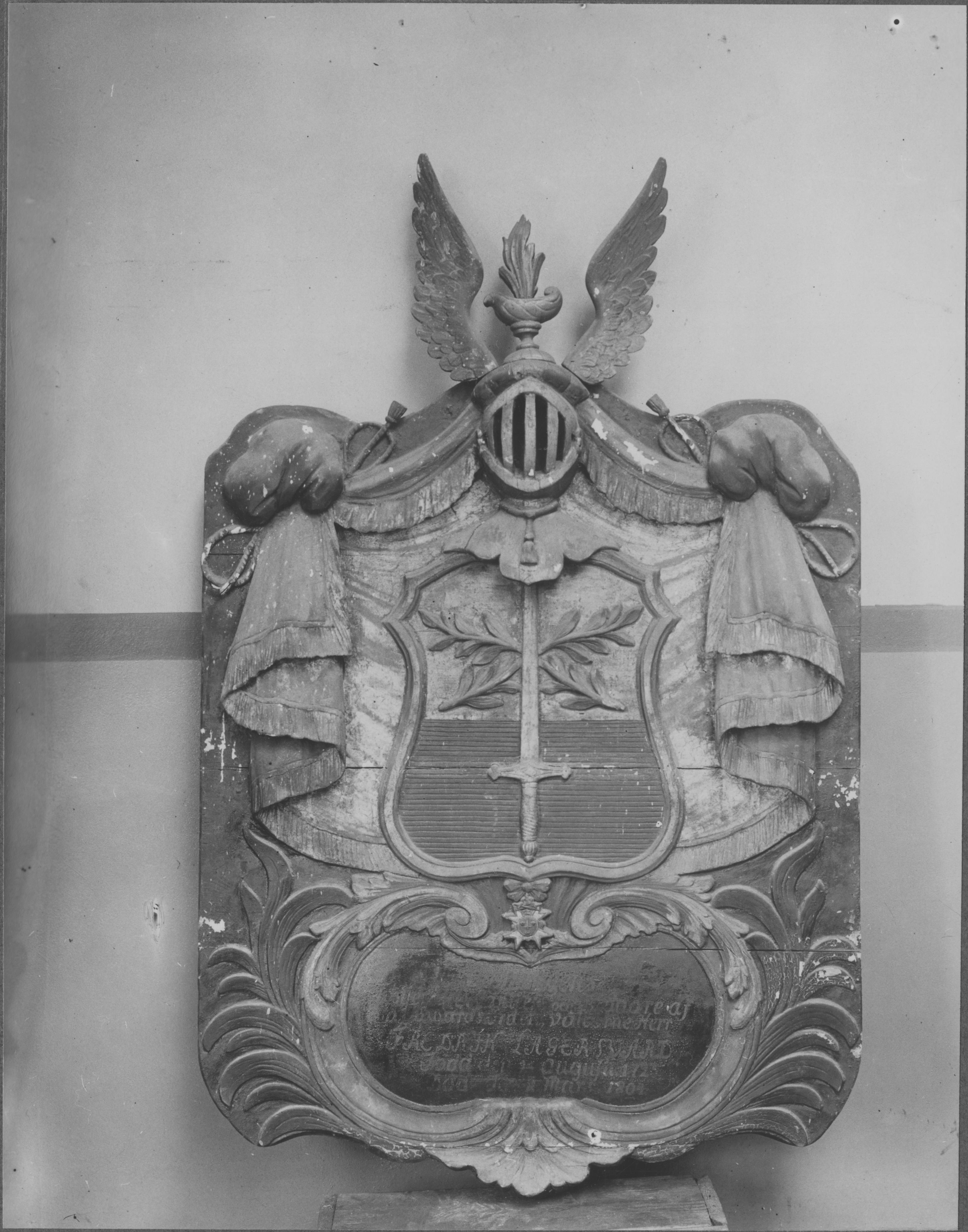 Beskrivning: Huvudbanér över kapten Fredrik Lagersvärd, 1723-1804. Trä, skulpterat och målat. Hjärtvapen med svärd av silver samt två lagerkvistar. Bakom ett draperi med guldfrans. Före konservering.