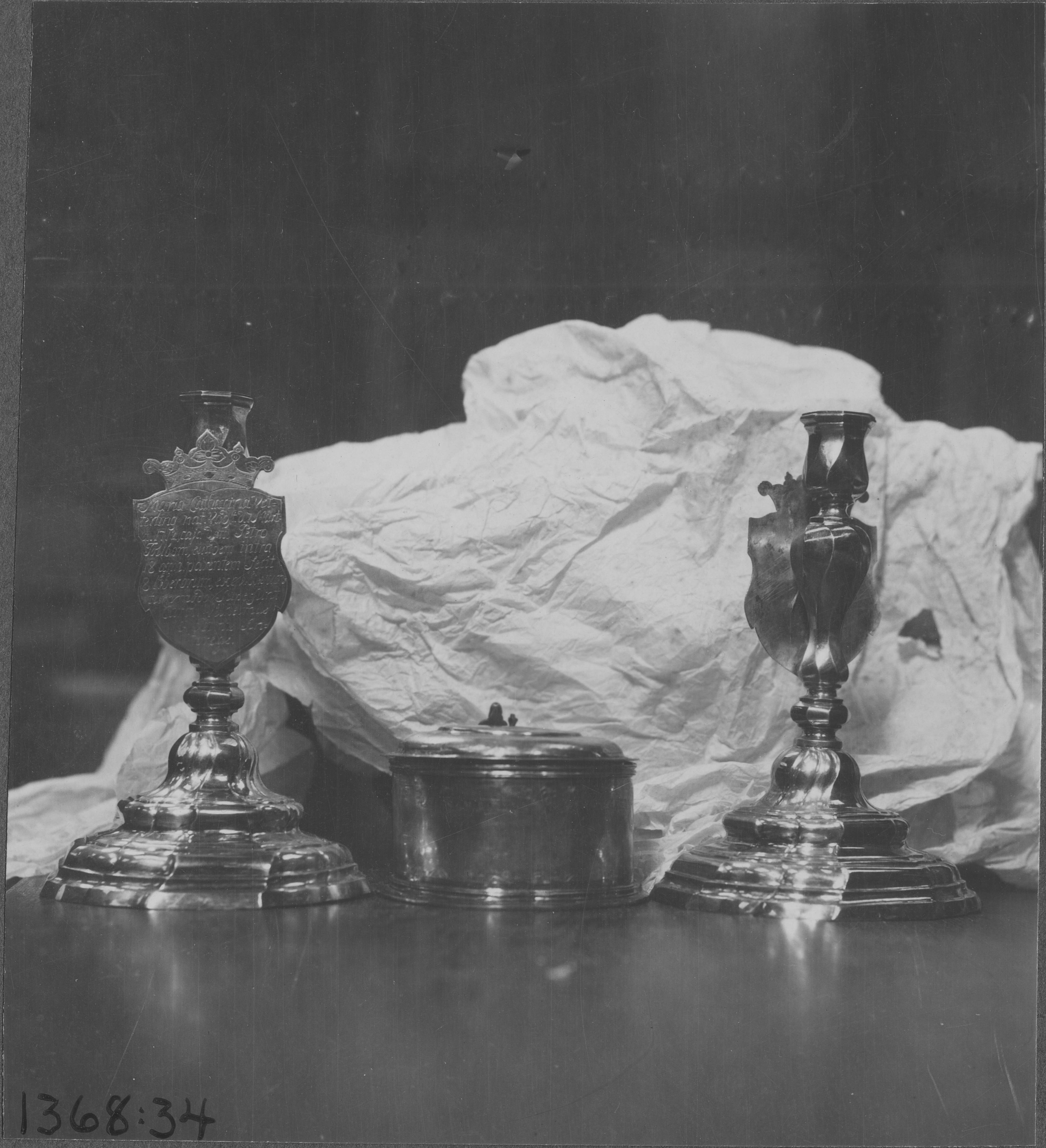Beskrivning: Oblatask av silver omgiven av ljusstakar. Snabbinventering.