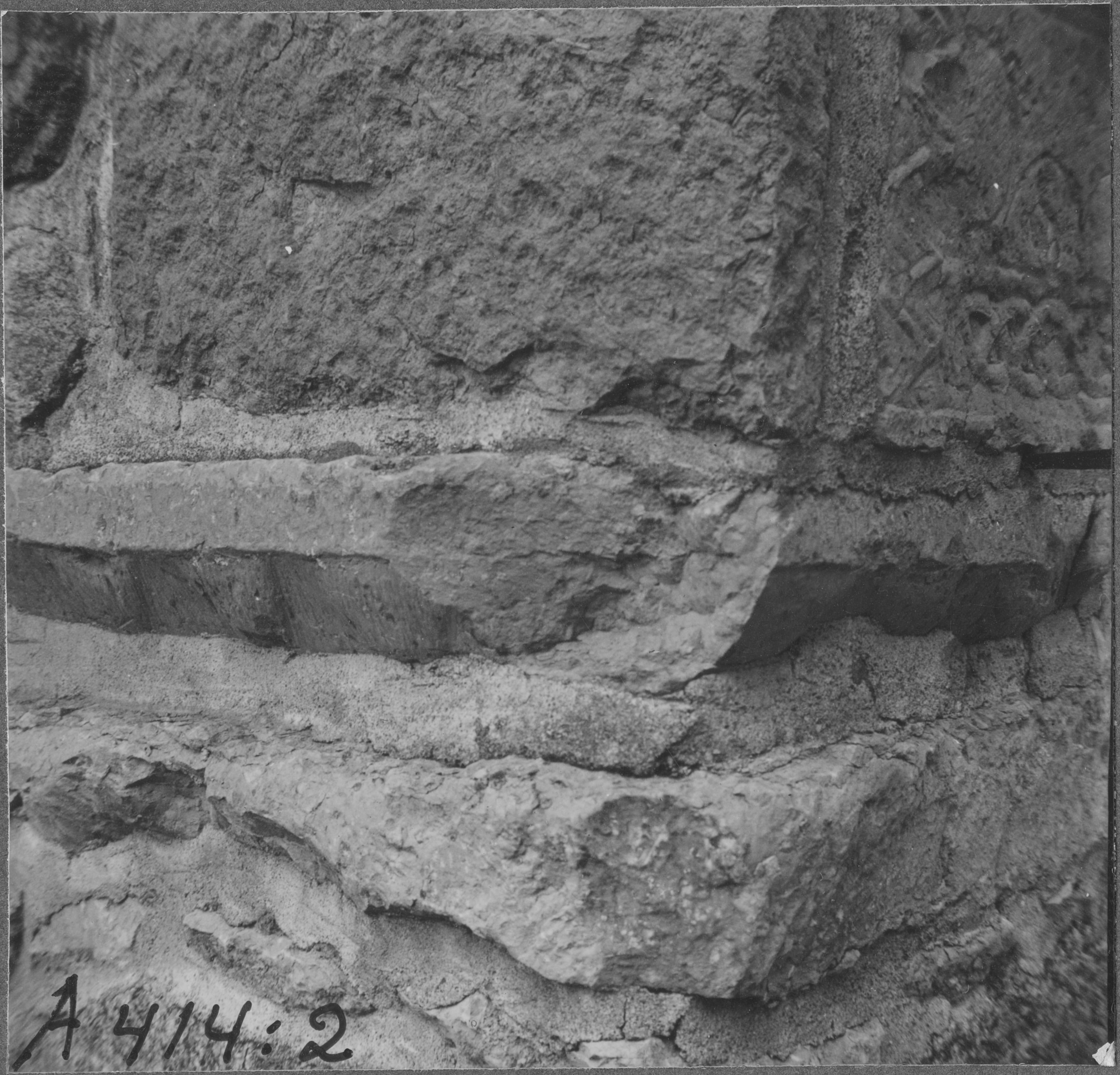 Beskrivning: Södra korsarmens sydvästra hörn. En sekundärt inmurad kalksten med reliefmönster synlig till höger.