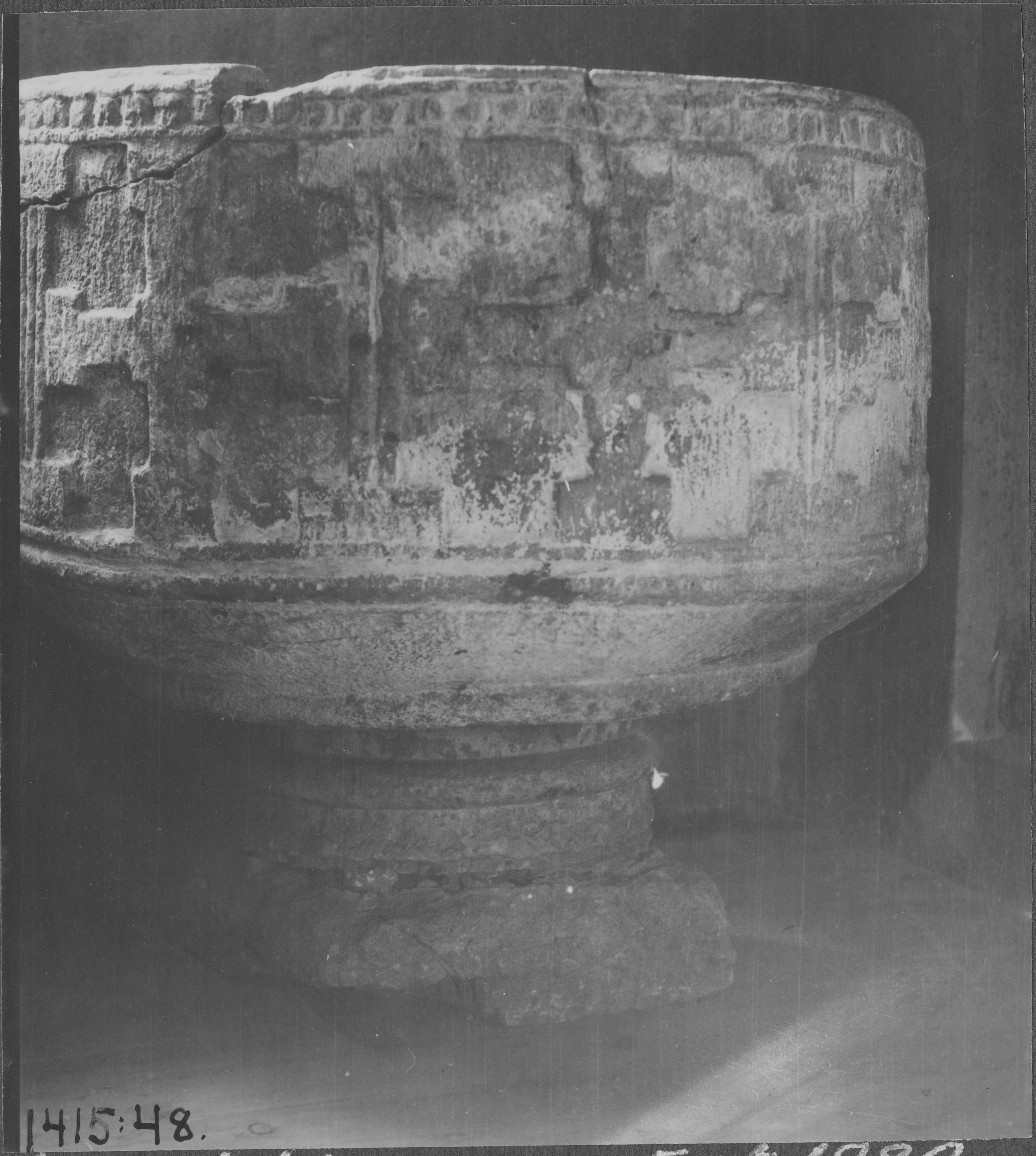 Beskrivning: Romansk dopfunt med kors i låg relief runt cuppan.