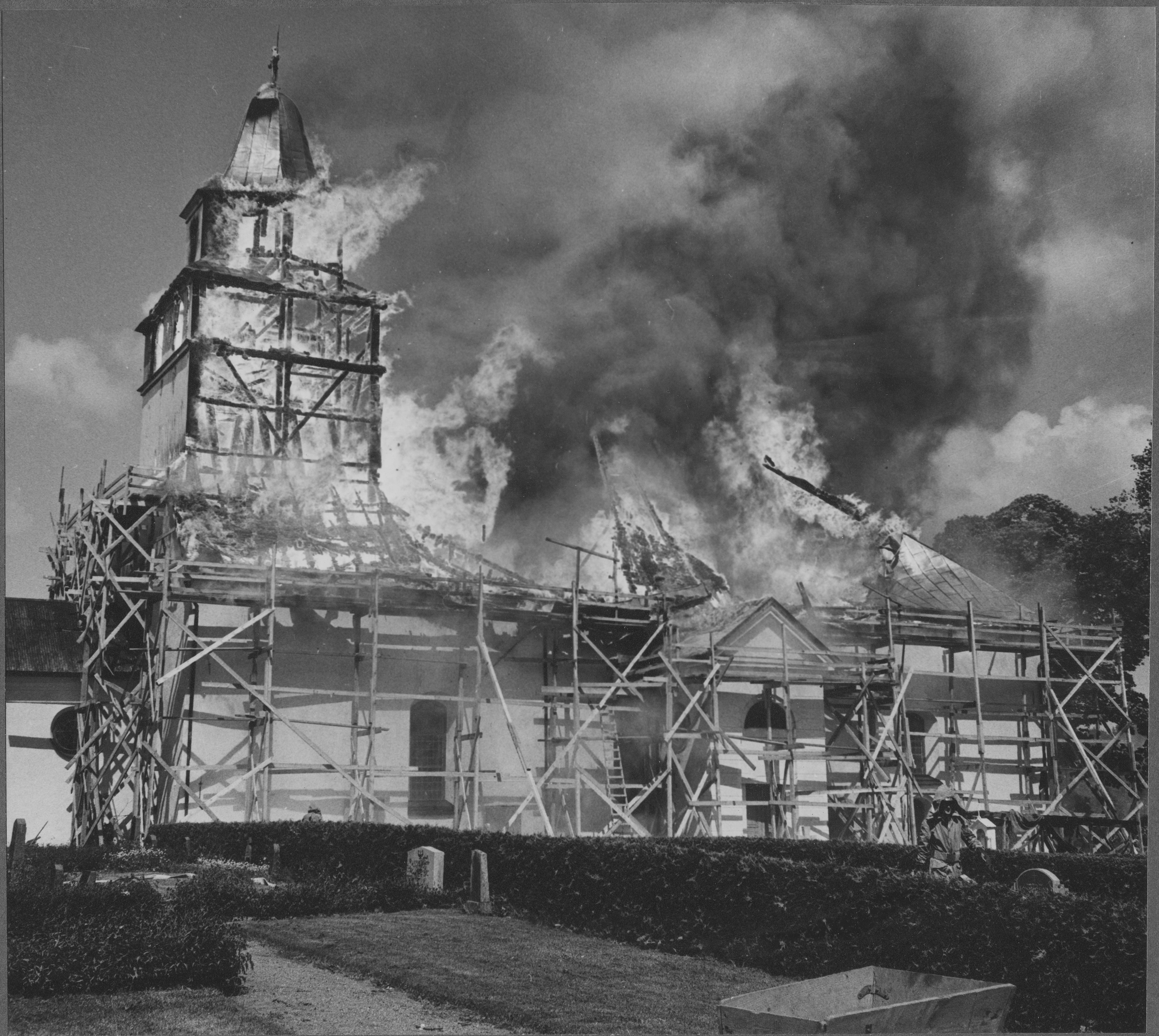 Beskrivning: Branden 21 juni 1961. Kyrkan från söder.