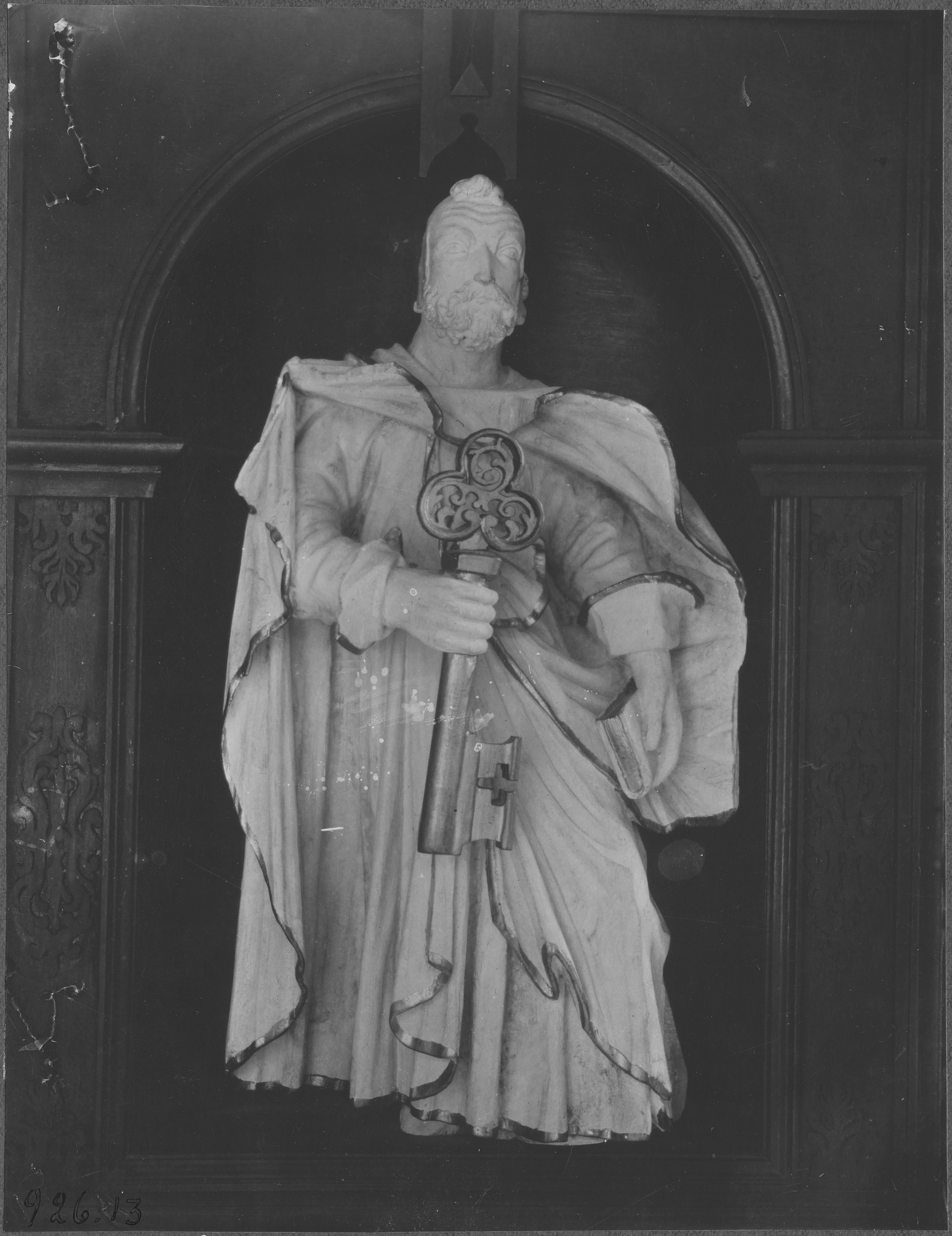 Beskrivning: Detalj av predikstolen, aposteln Petrus.