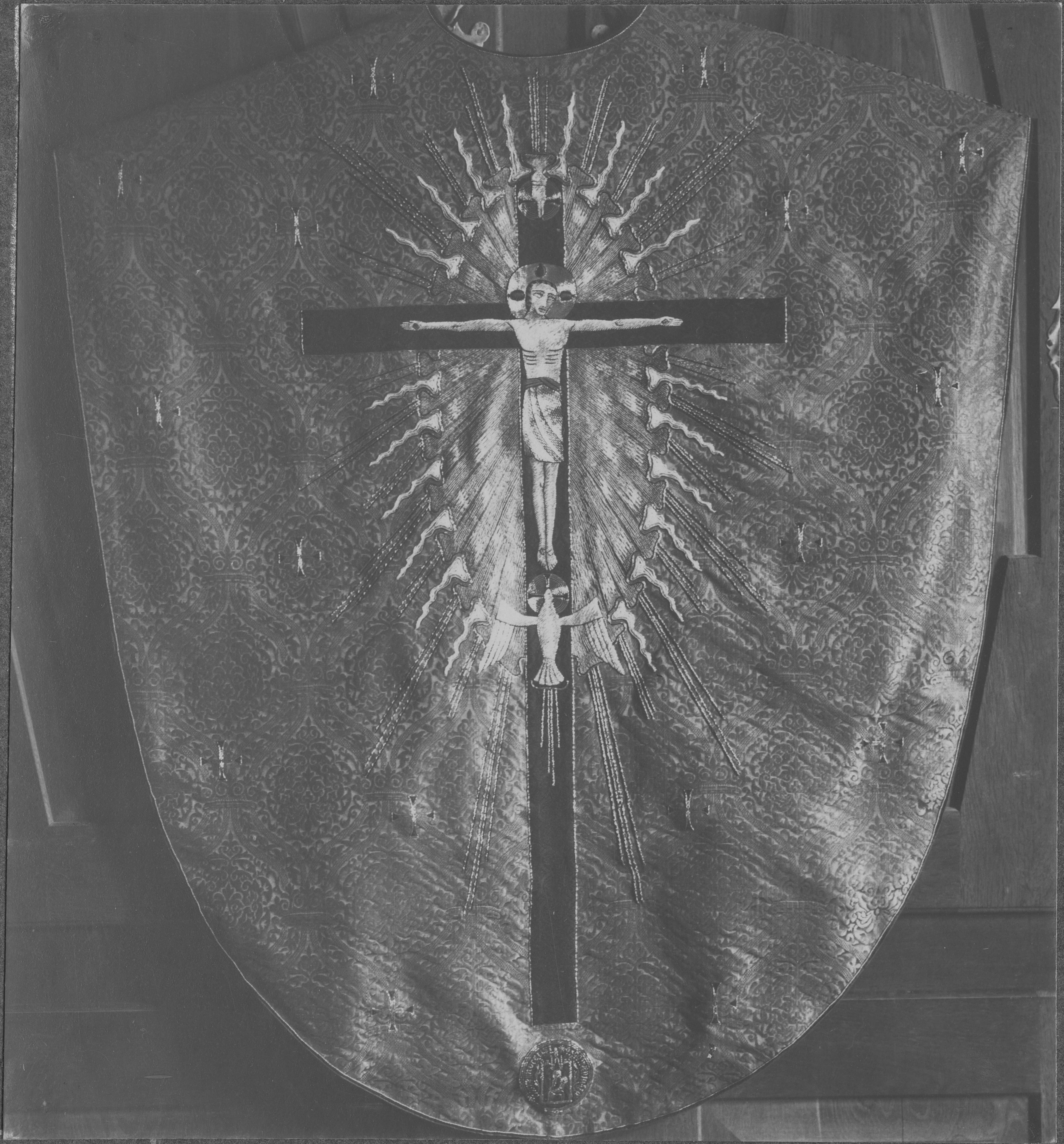 Beskrivning: Mässhake av grön sidendamast, utförd av Licium 1930.