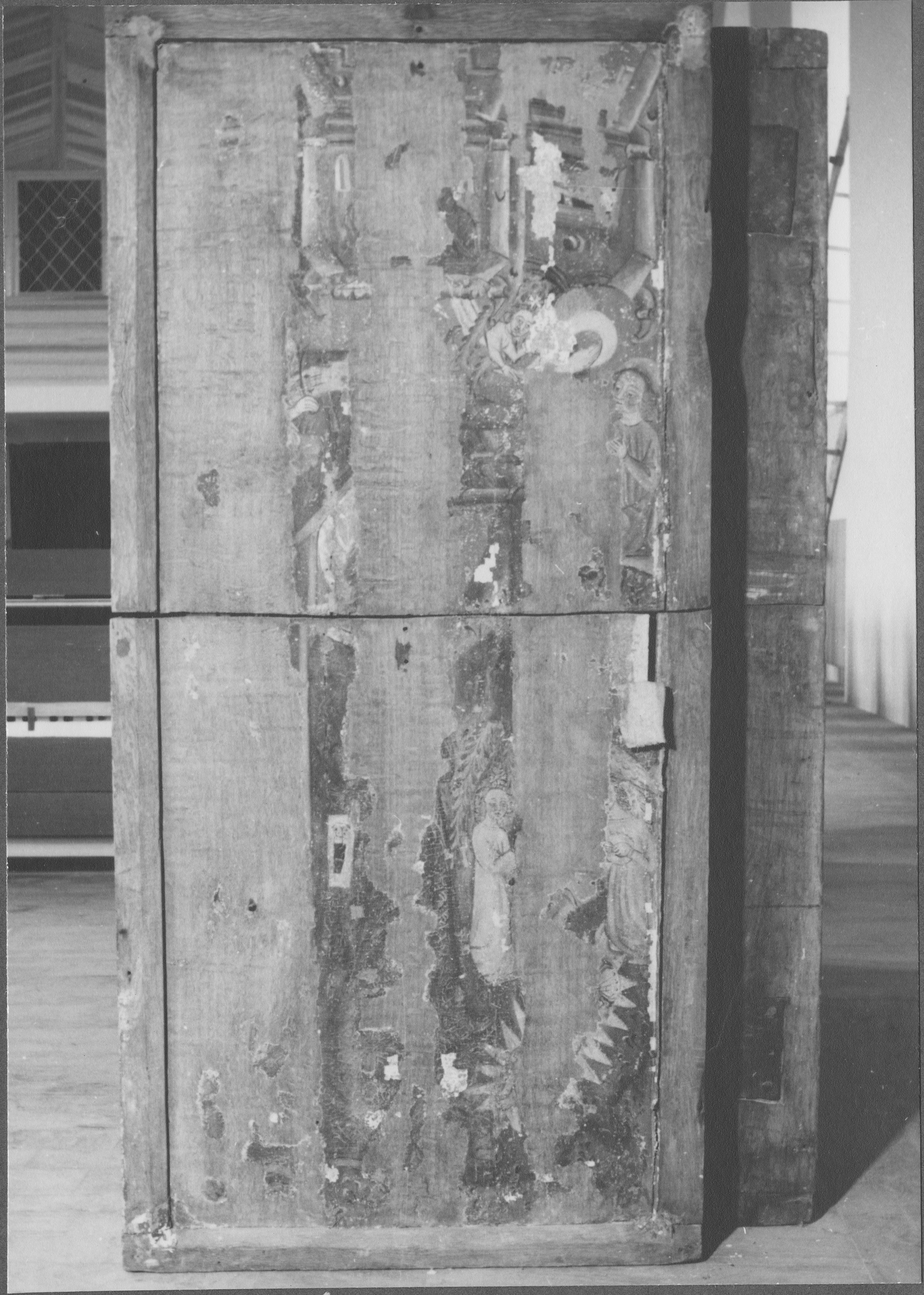 Beskrivning: Baksida av en av altarskåpets flyglar. Före konservering.