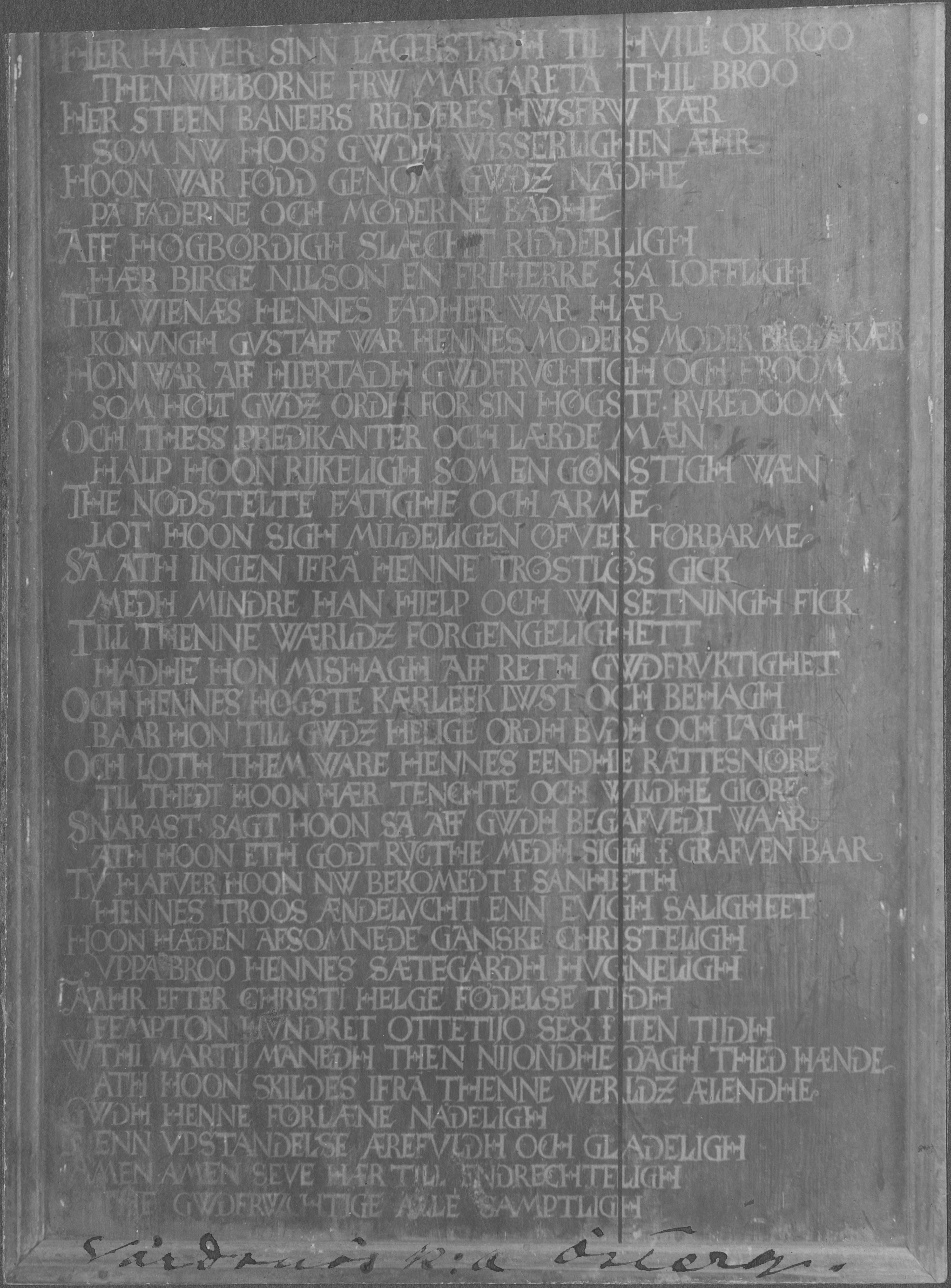 Beskrivning: Minnestavla över Margareta Birgersdotter Grip af Vinäs (1537-1586) gift med Sten Axelsson Banér.