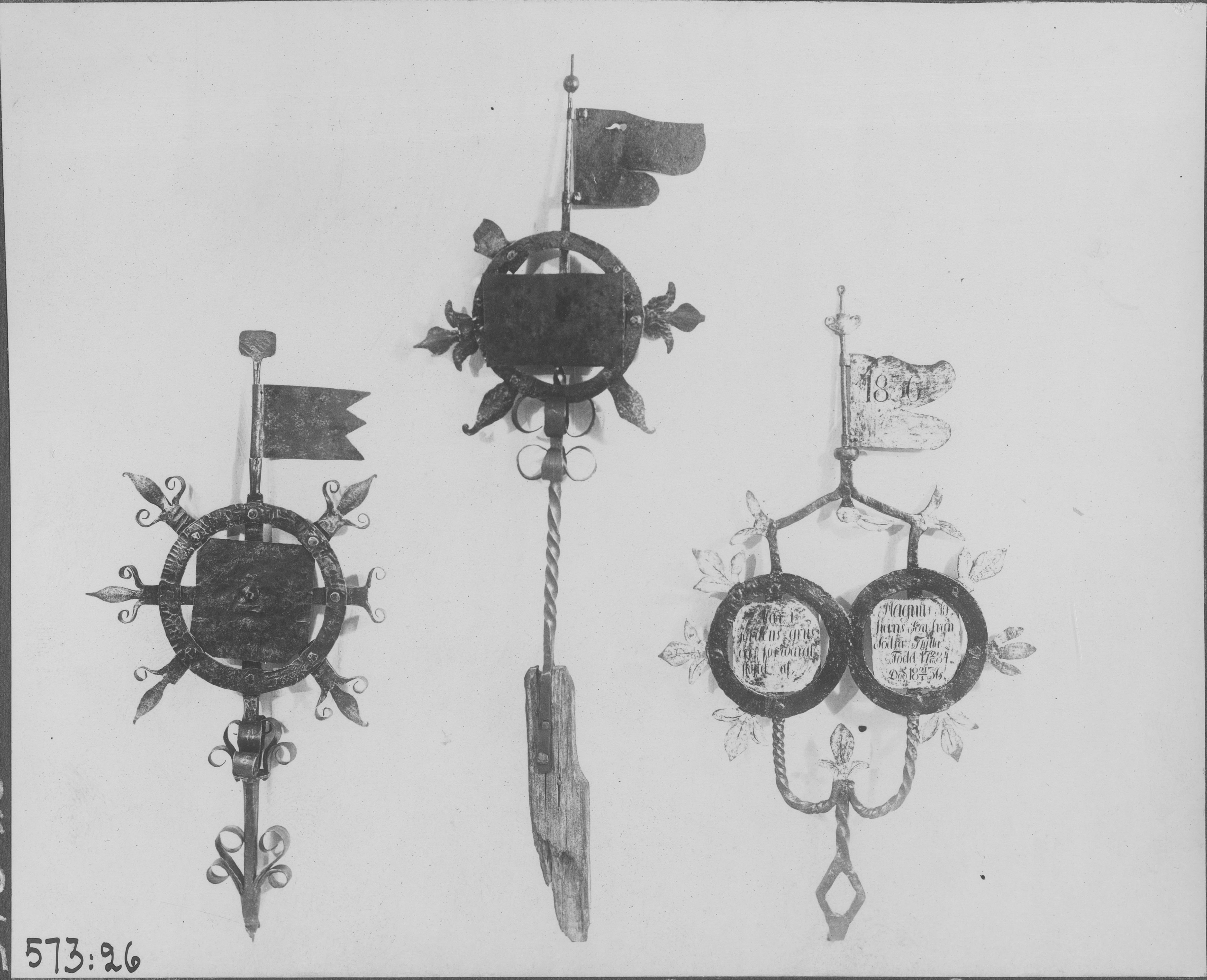 Beskrivning: Gravvårdar av smidesjärn från 1700- och 1800-talen. Efter konservering.