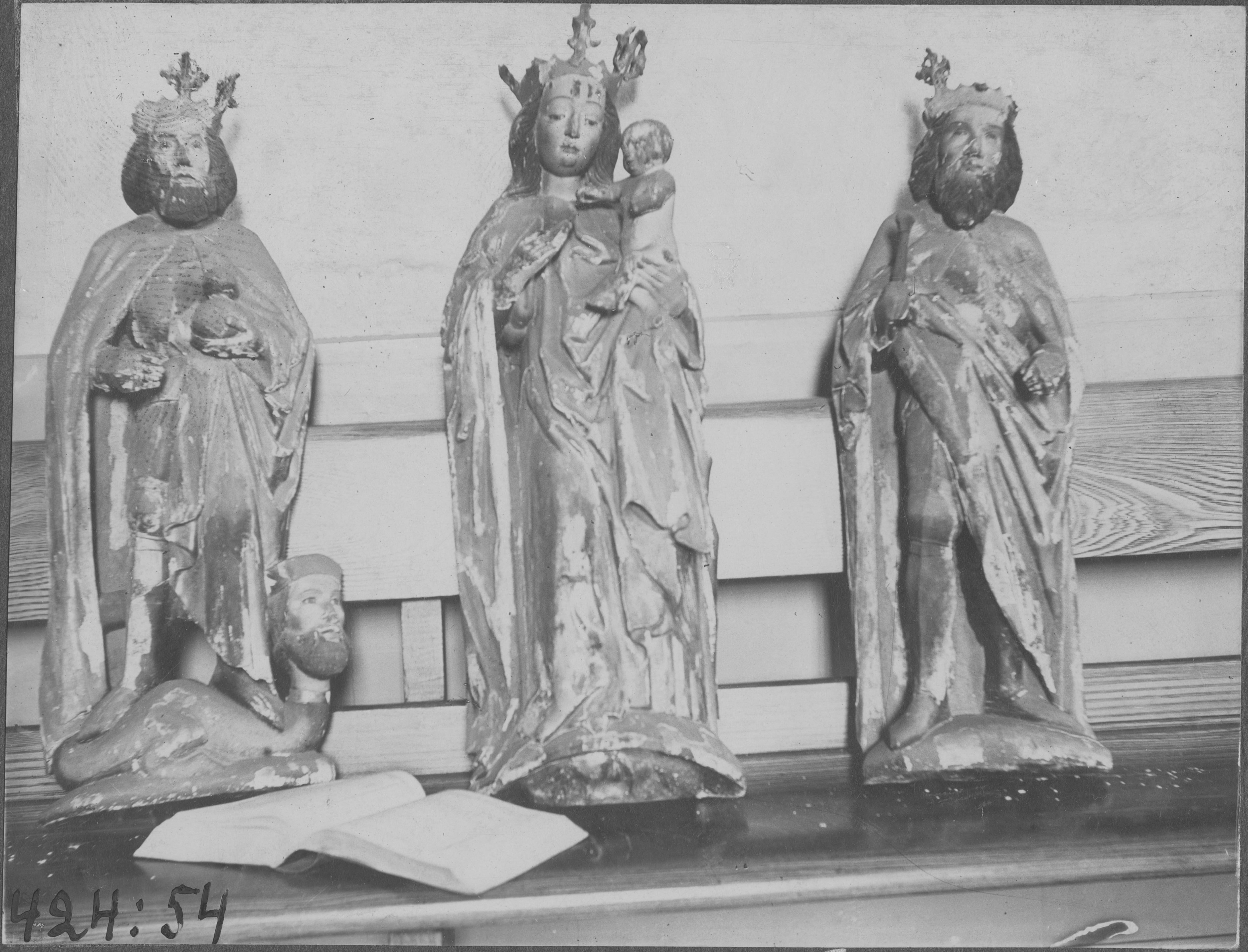 Beskrivning: S Olov, Maria och S Erik, tillhörande altarskåp från 1400-talets sista fjärdedel, nu i SHM. Fotot från 1900-talet början.
