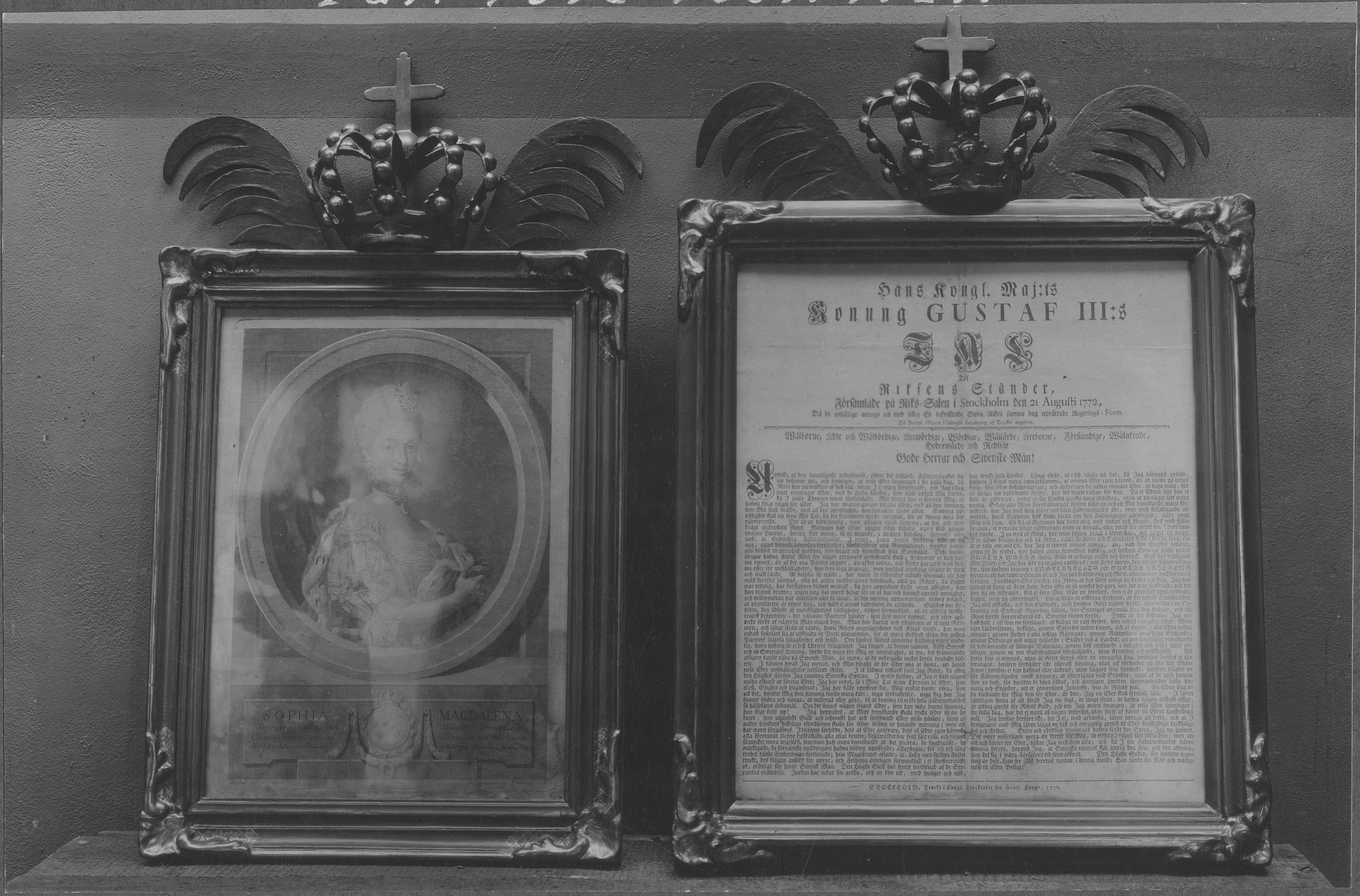 Beskrivning: Tavla över Sophia Magdalena (kopparstick) och Gustav III:s tal. Foto efter restaurering 1929.
