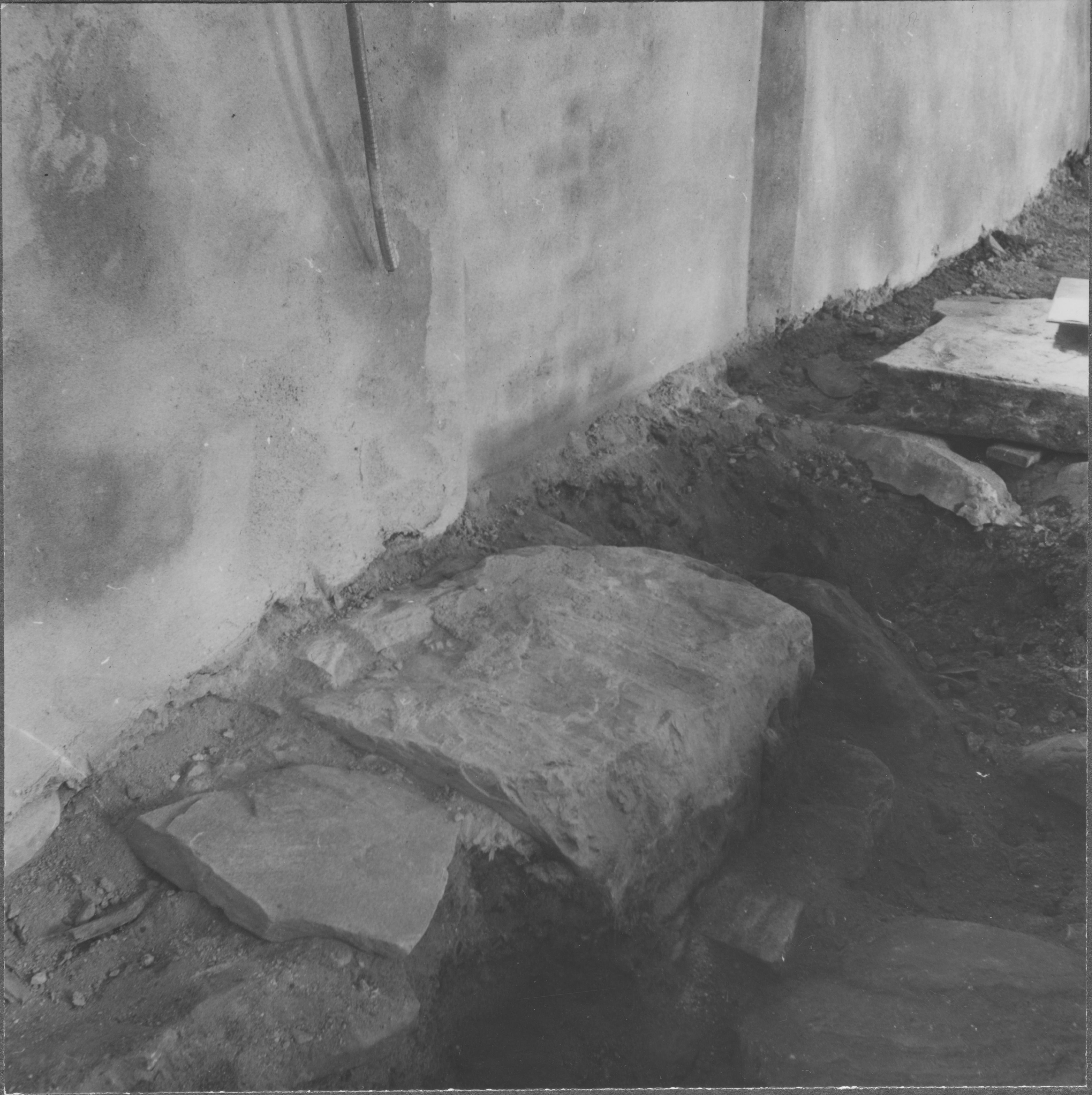 Beskrivning: Pilastergrund omedelbart öster om korportalen samt delar av grundmur till romanska kyrkans kor.