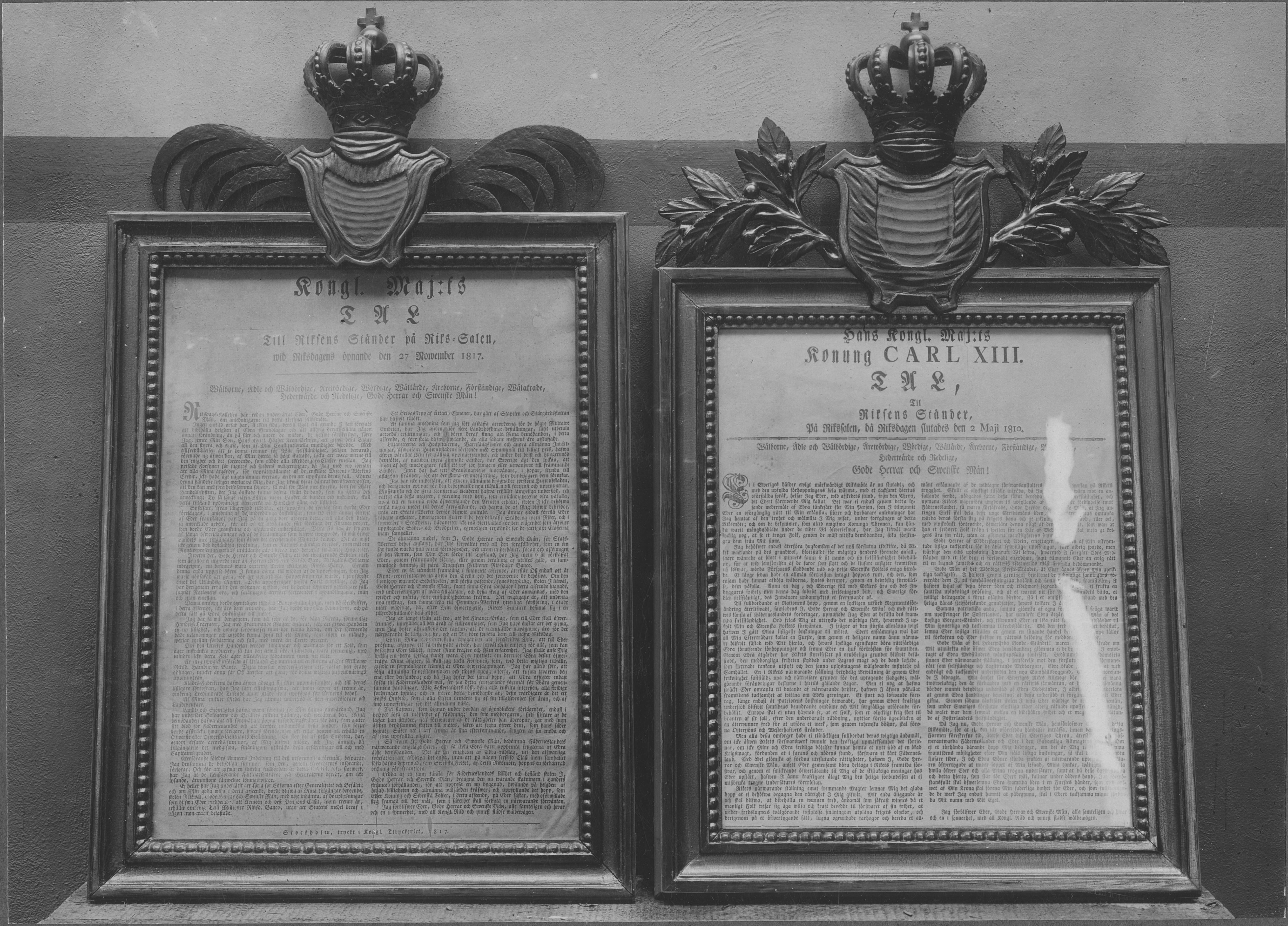 Beskrivning: Tavlor över K Majt:s tal 1817 och Karl XIII:s tal. Foto efter restaurering 1929.