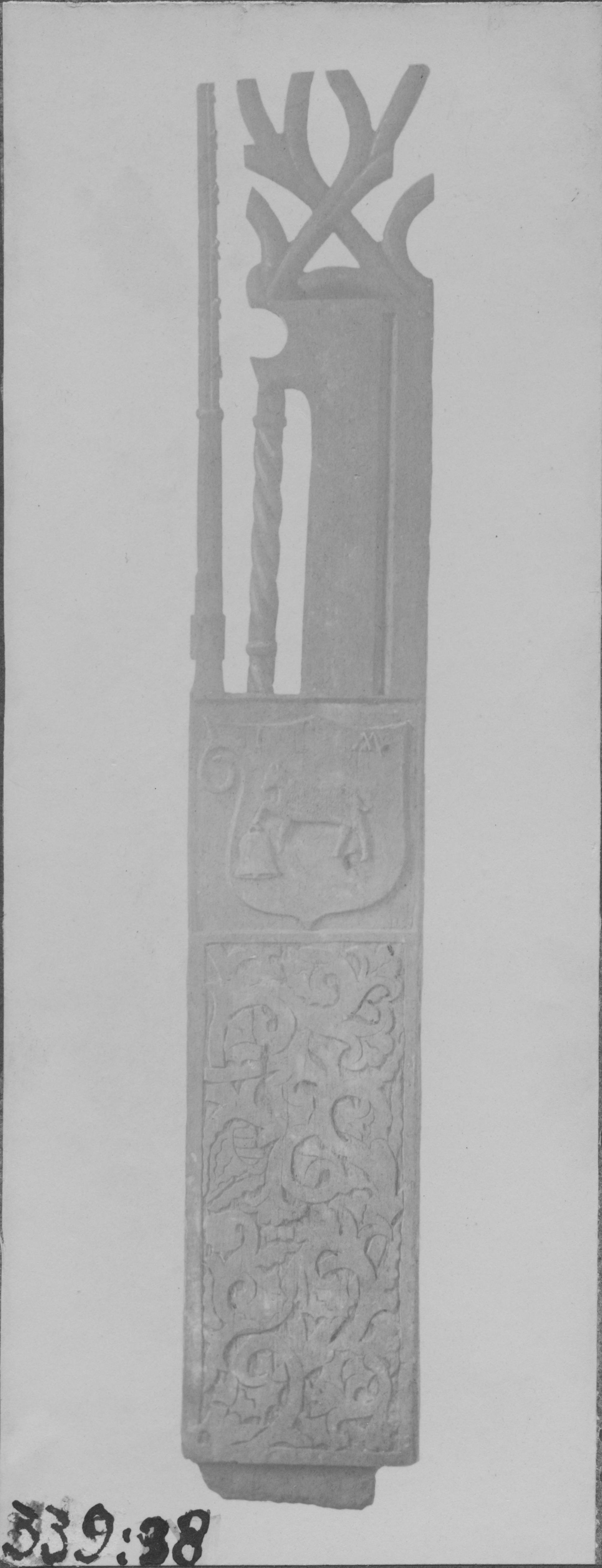 Beskrivning: Parti av korstol på vinden över västra valvet.