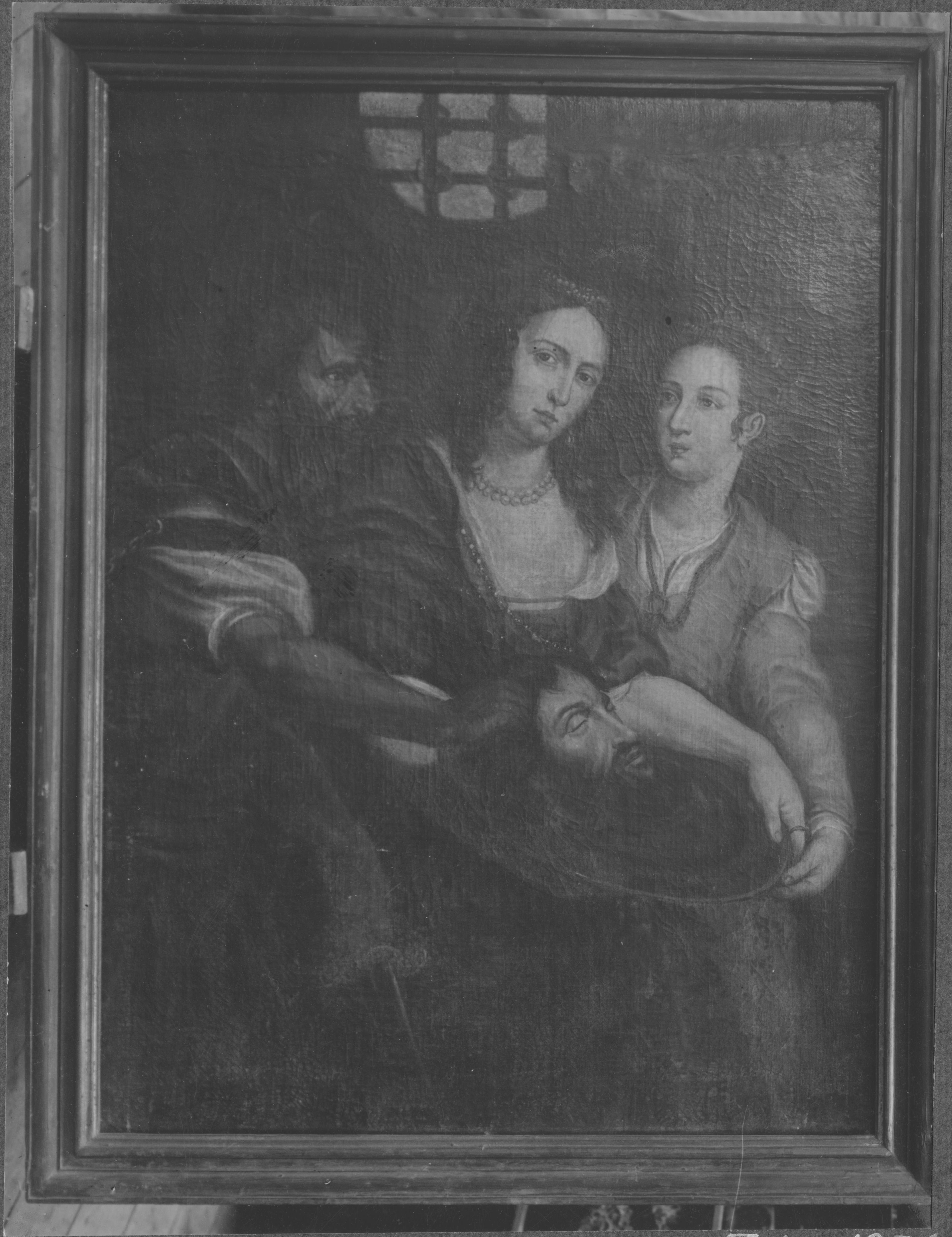 Beskrivning: Tavla föreställande Salome med Johannes huvud på ett fat. Omgiven av tjänarinna och bödel. Olja på duk. Omkring 1600. Före konservering 1936.