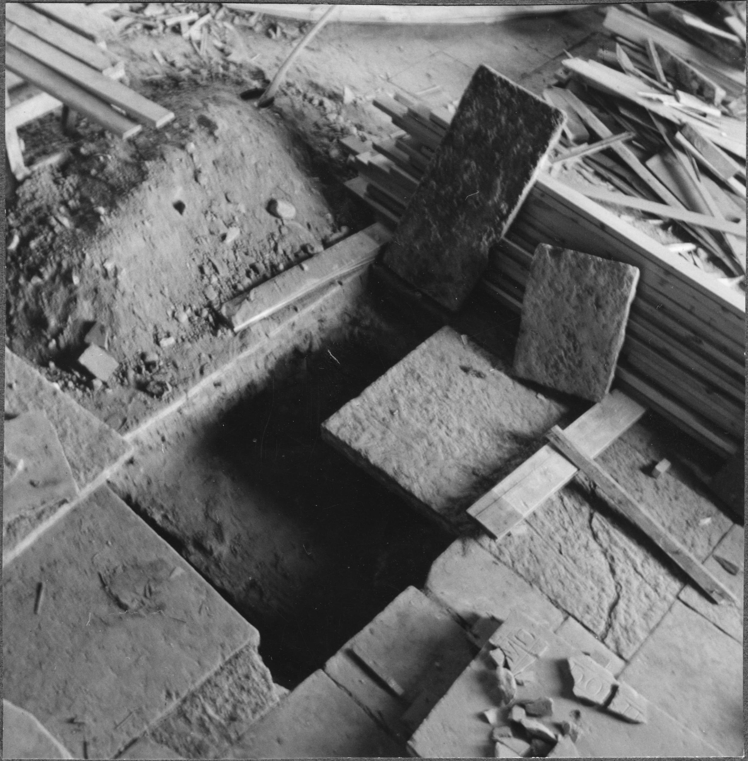 Beskrivning: Restaurering i kyrkan. I hålet mellan golvstenarna skymtar södra långhusmuren ca 6 meter öster om västra tornet. Från nordväst.