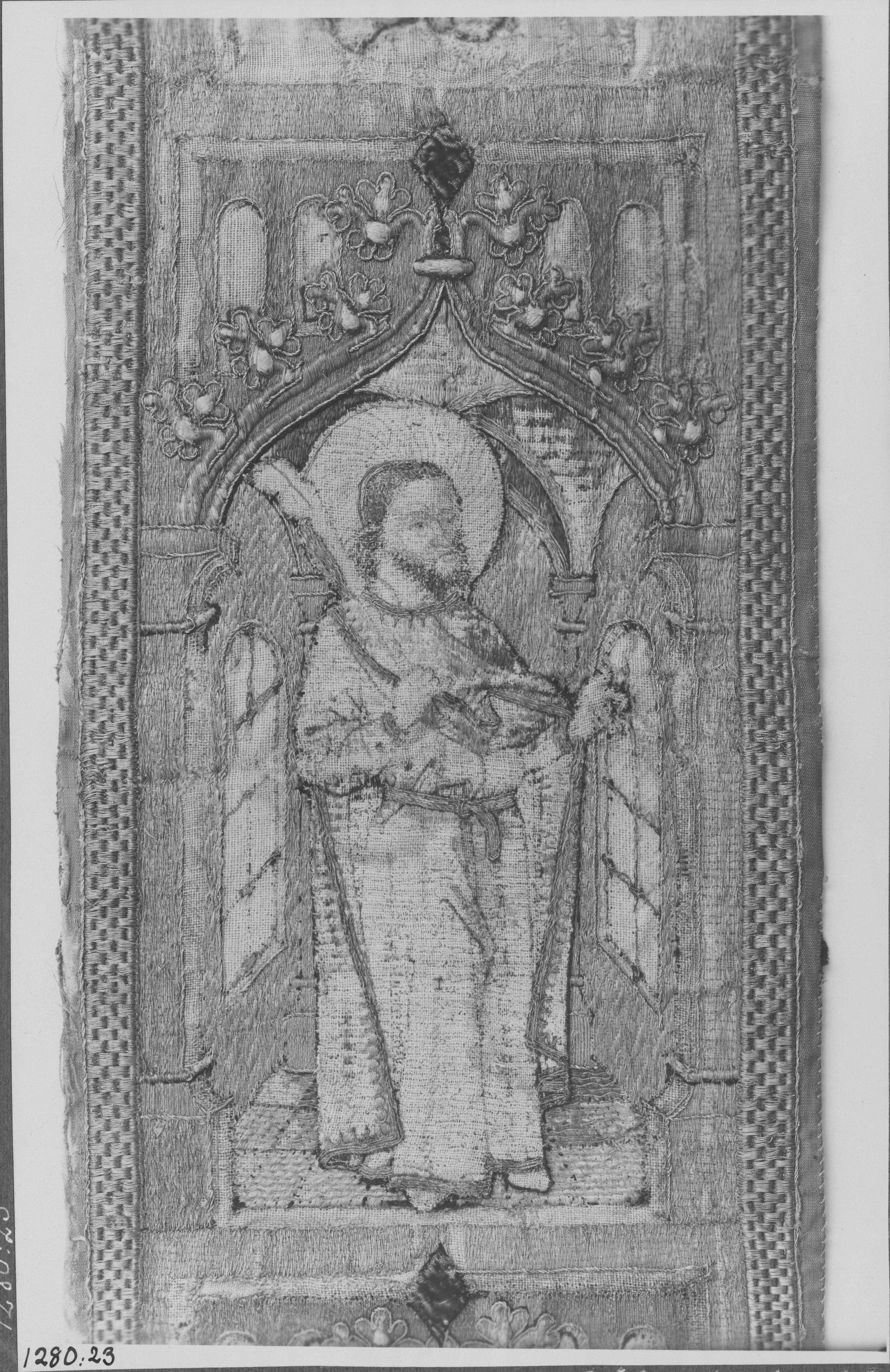 Beskrivning: Korkåpebräm, broderat, detalj. Senmedeltid-1500-tal. Textilutställningen i Stockholm 1929. Nummer 122.