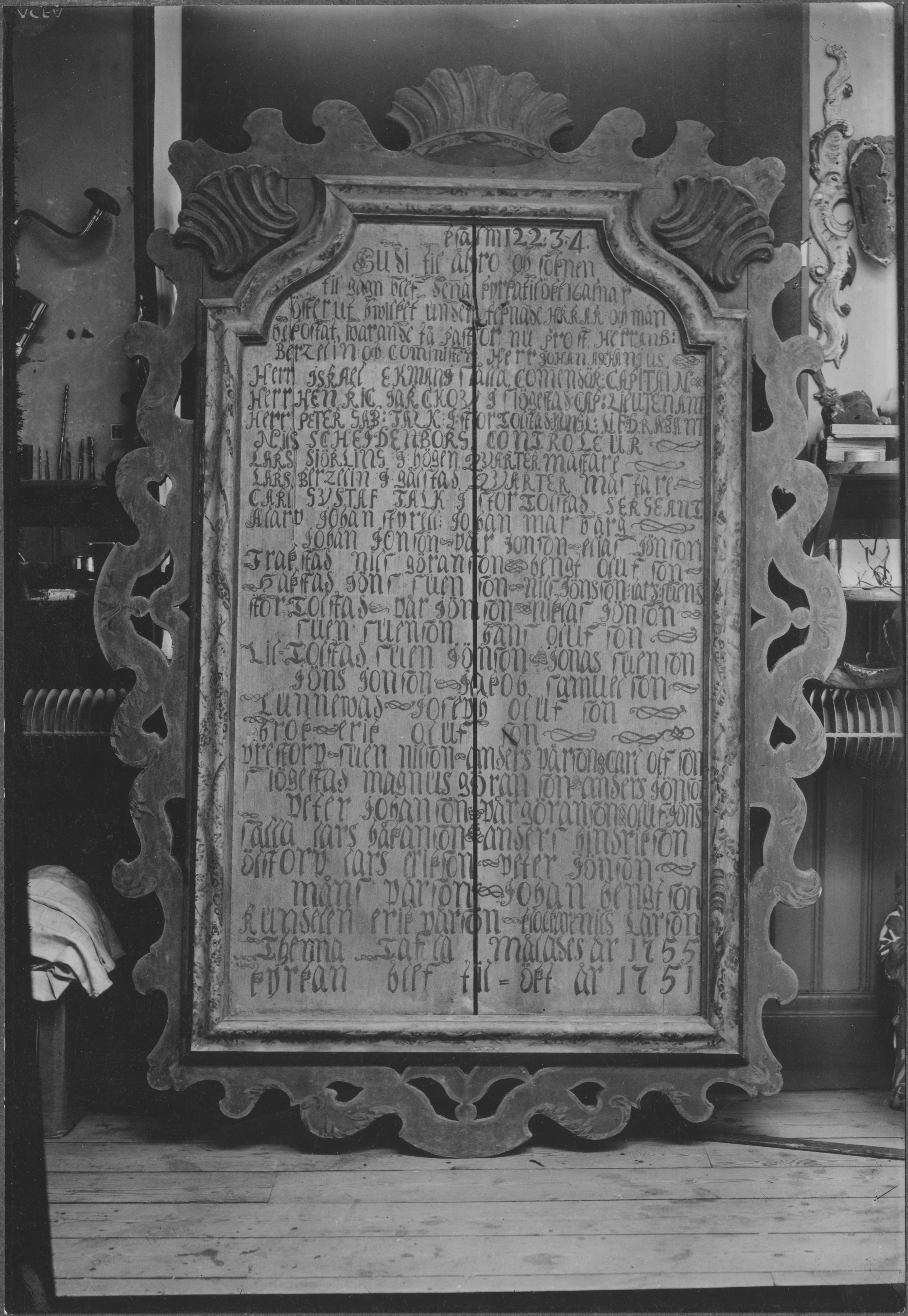 Beskrivning: Minnestavla över gamla kyrkans tillbyggnad 1751.