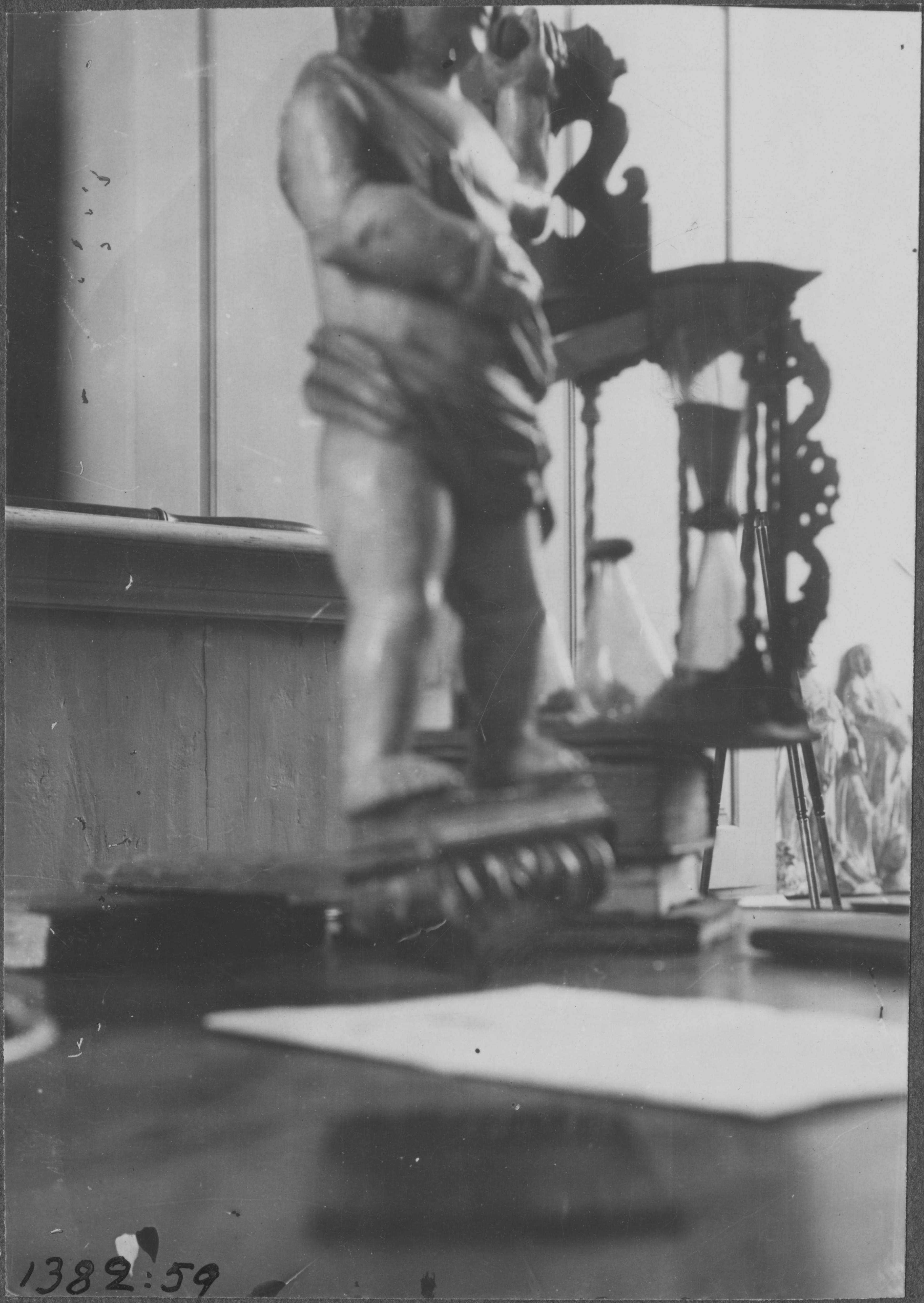 Beskrivning: Ängel av trä omgiven av förgylld slöja. Har sannolikt tillhört en predikstol från 1700-talets början. Snabbinventering.
