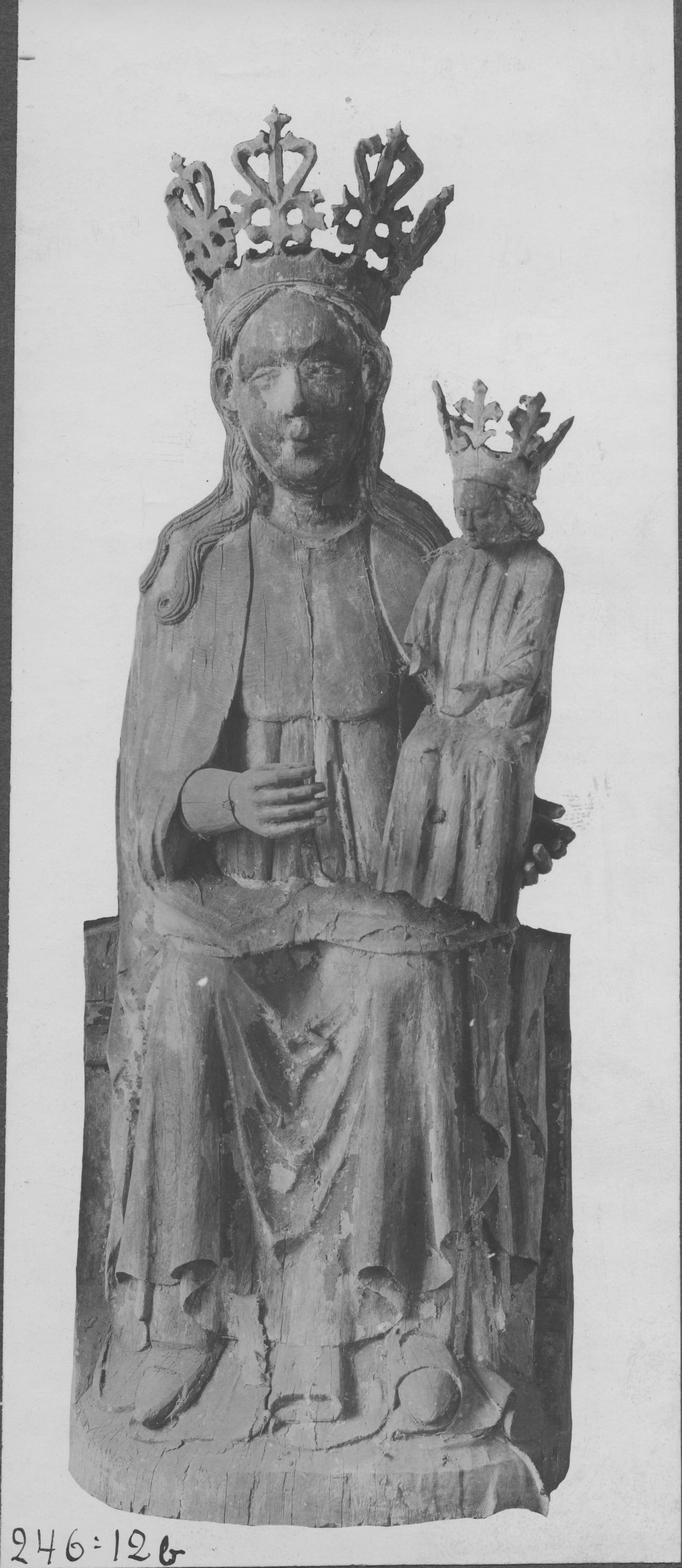 Beskrivning: Träskulptur föreställande Madonnan och barnet.