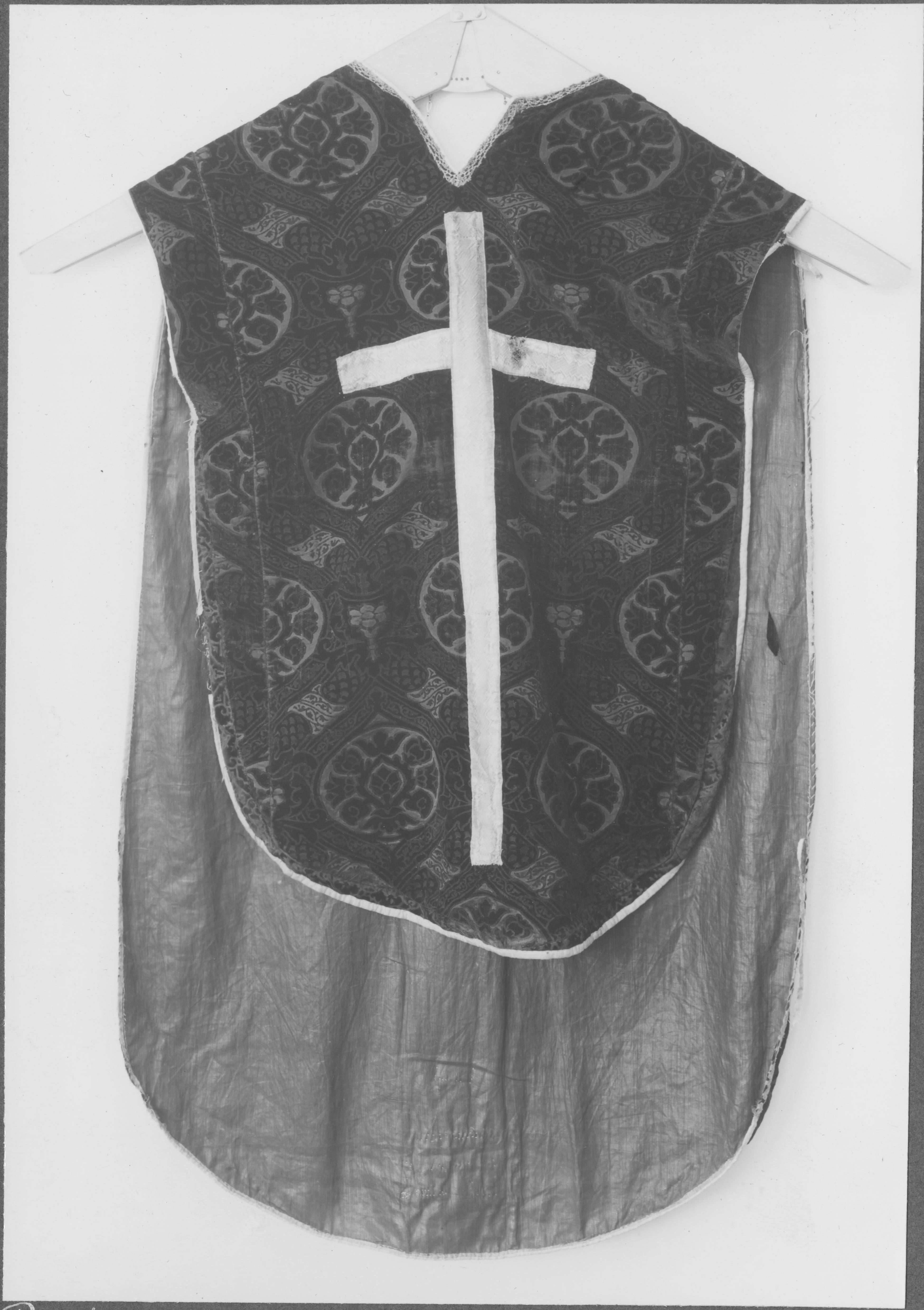 Beskrivning: Mässhake av svart mönstrad sammet. Bröststycket med kors av guldgalon. Före konservering.