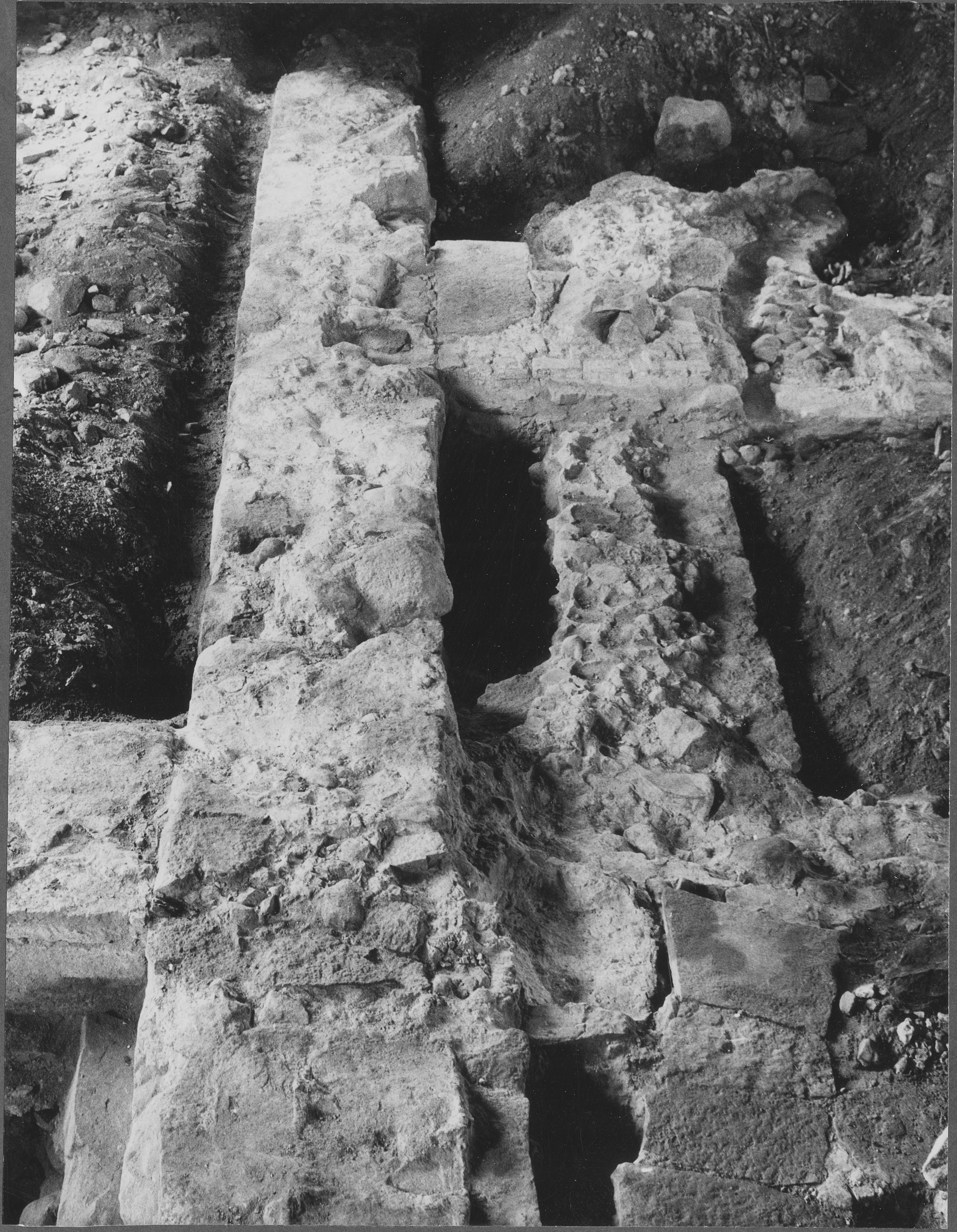 Beskrivning: Gamla grundmurar från väster. Norra sidans långmur, kormur och absidrest med senare tegelpilaster, i förgrunden till vänster östra sakristiemurens anslutning till långmurens skråkant och till höger sent golv.