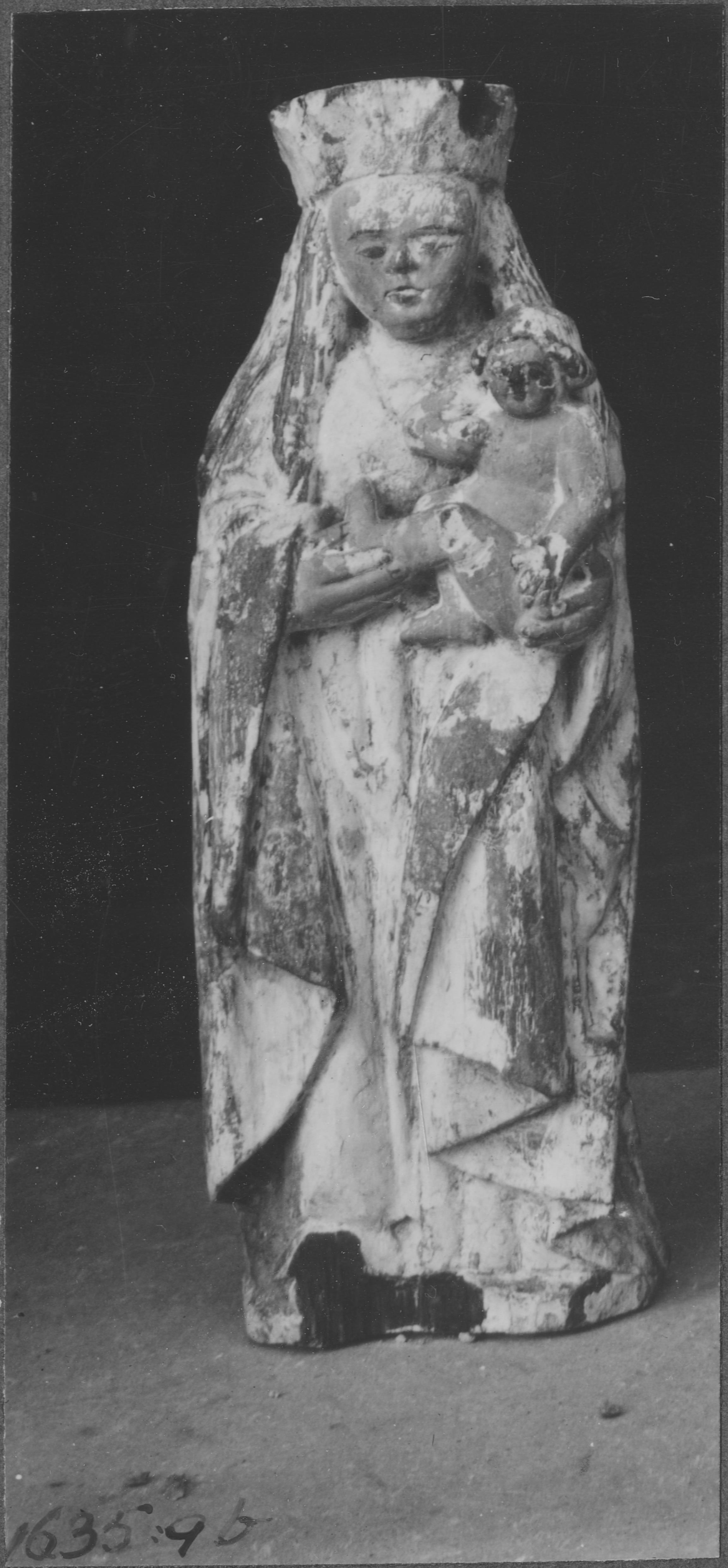 Beskrivning: Maria med Jesusbarnet. Snidad och målad ek. Senmedeltidaa arbete. Från Snabbinventeringen.