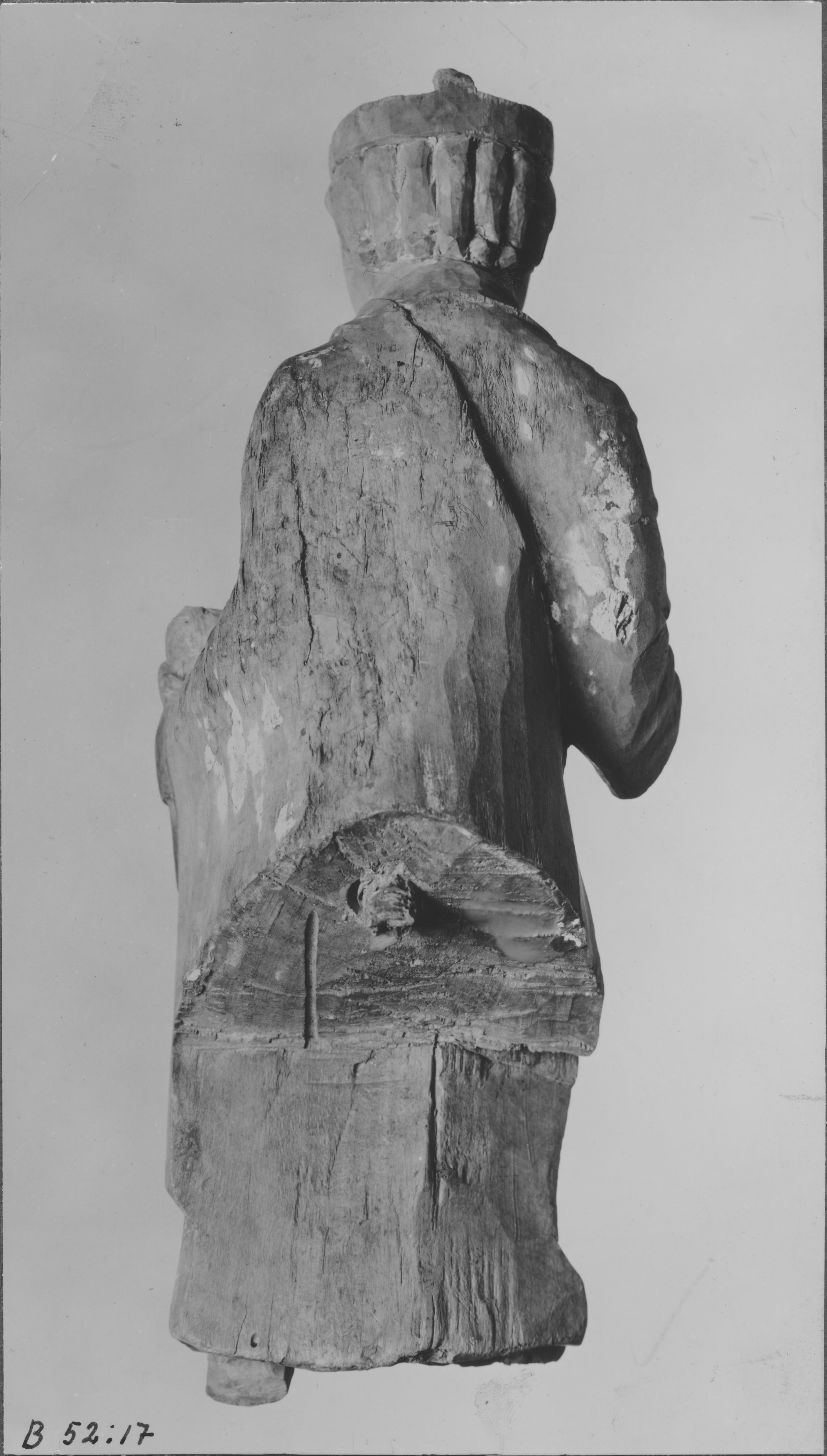 Beskrivning: Träskulptur föreställande Madonnan och barnet, barnets baksida.