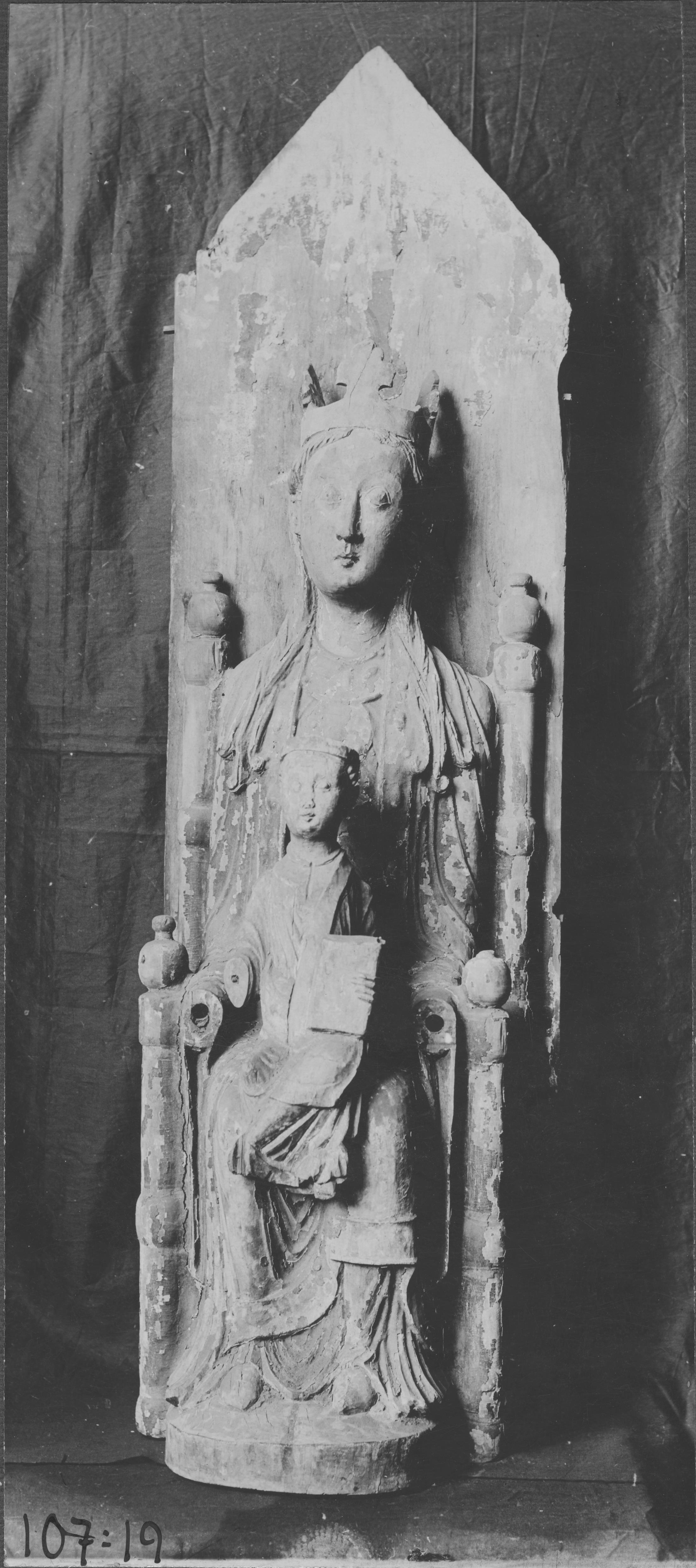 Beskrivning: Träskulptur föreställande Madonnan och barnet.