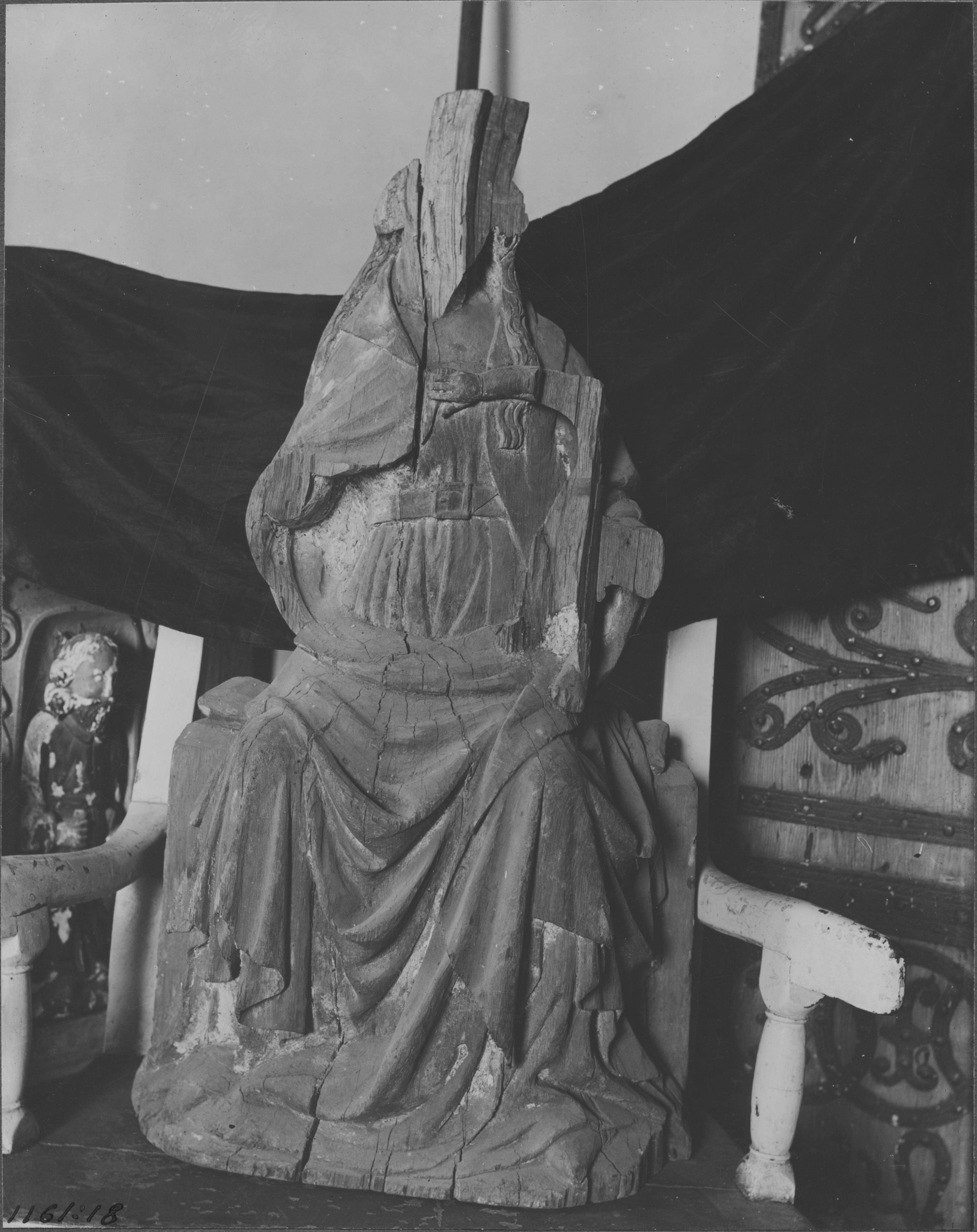 Beskrivning: Madonnabild av trä. Maria med det nu förlorade barnet. Ansiktet avspjälkat, armarna avslagna. 1400-talets början.