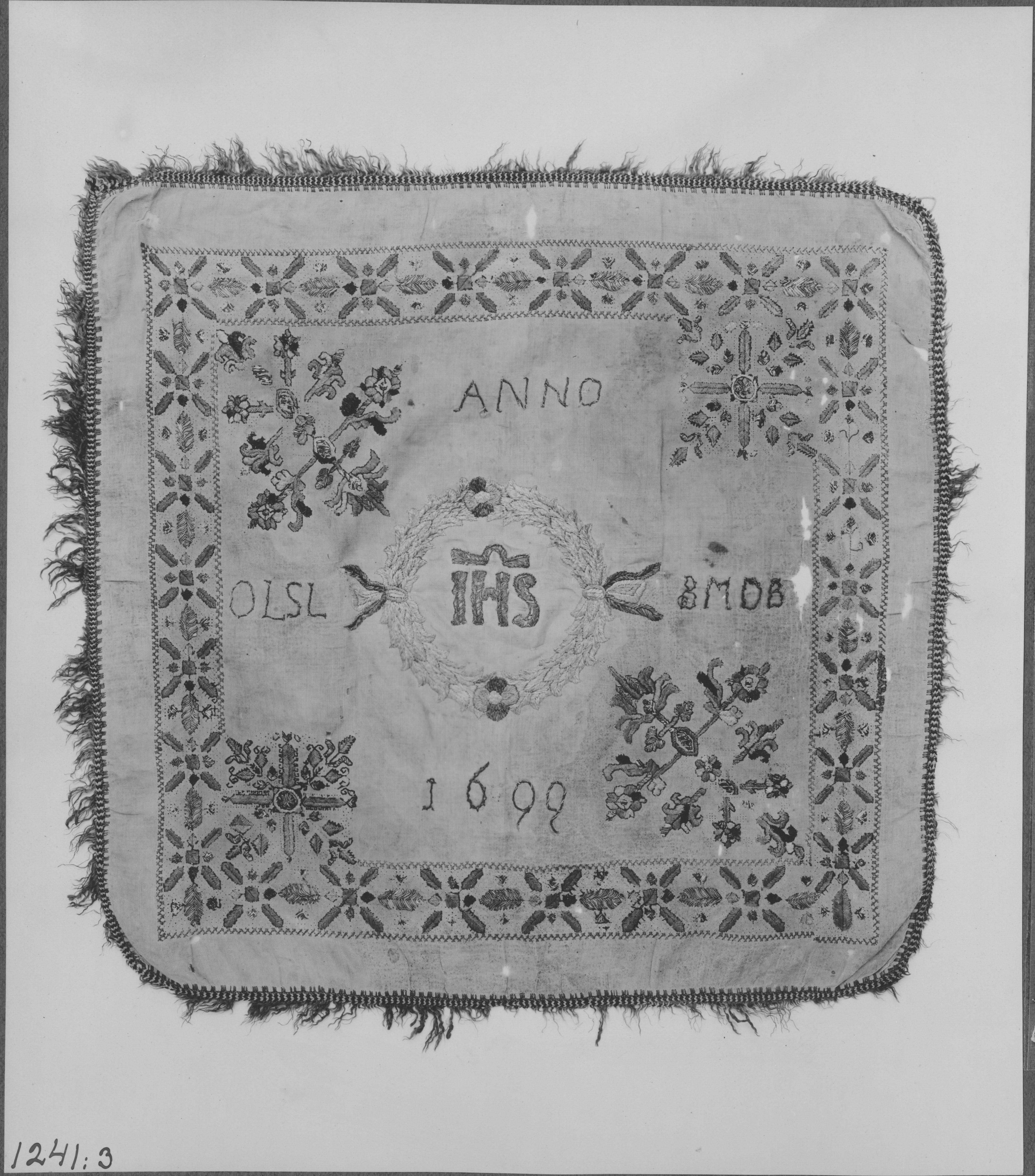 Beskrivning: Kalkduk med broderier. Gåva 1699 av sämskmakaren Olov Larsson. textilutställningen i Stockholm 1929. Nummer 386. Piertas 1908 nr 7. efter konservering.