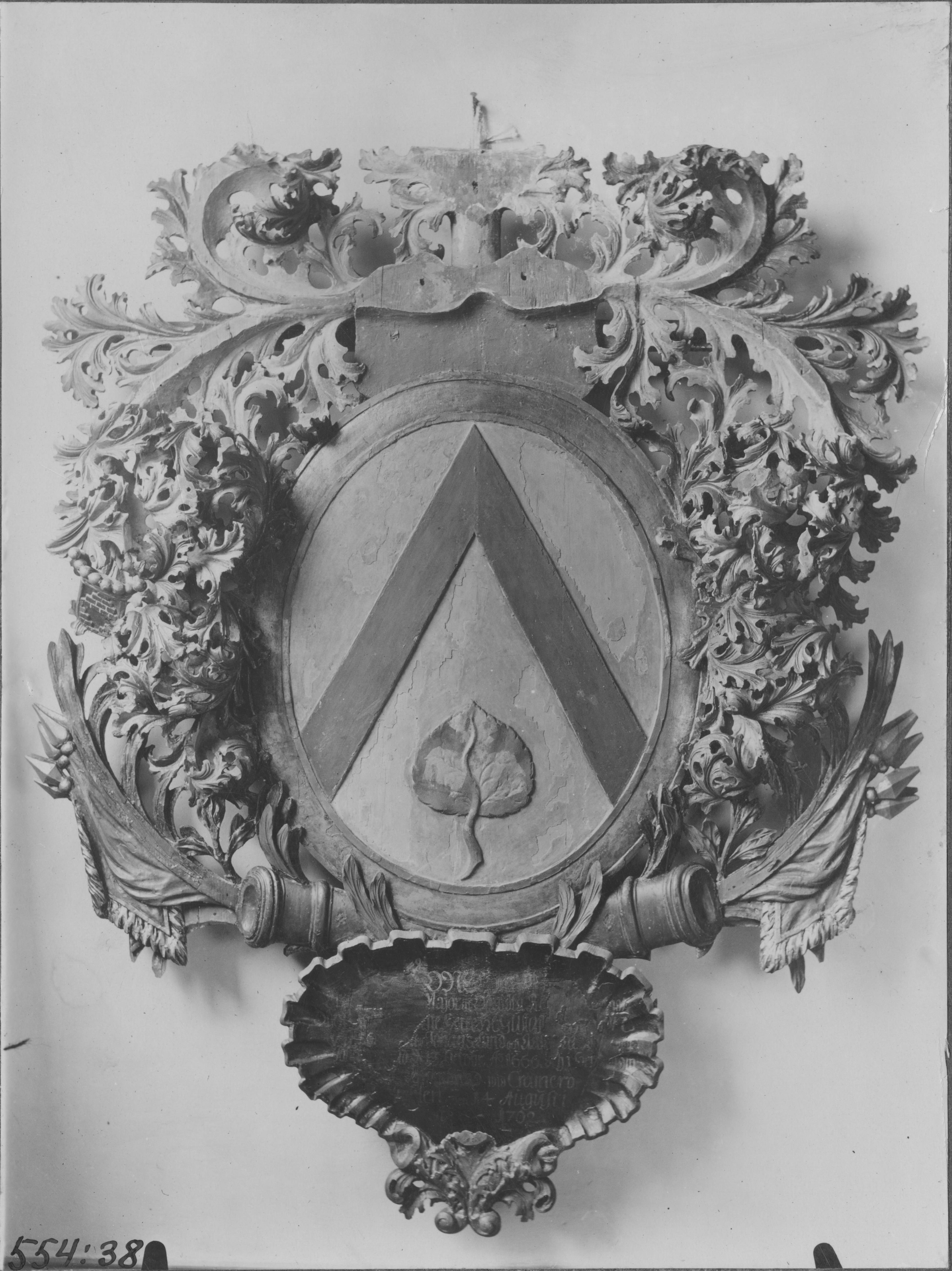 Beskrivning: Huvudbanér av trä, krederat och målat. Över en Ulfsparre. Blad under vinkel. Efter restaurering.