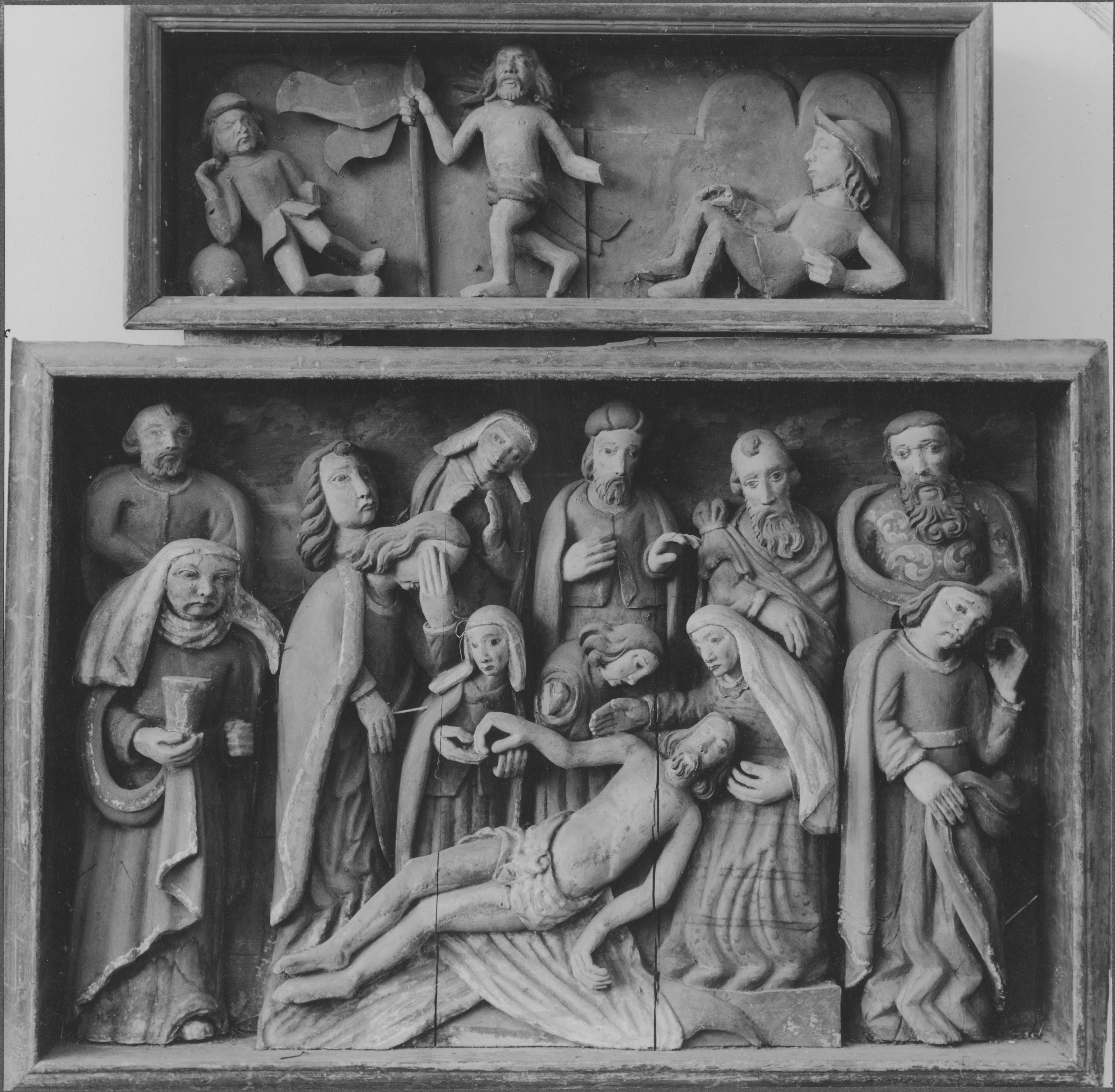 Beskrivning: Altarskåp i två avdelningar av skulpterat och målat trä. I nedre delen Kristus begråtes omgiven av sörjande. I övre delen Kristus springande omgiven av två krigare. 1695.