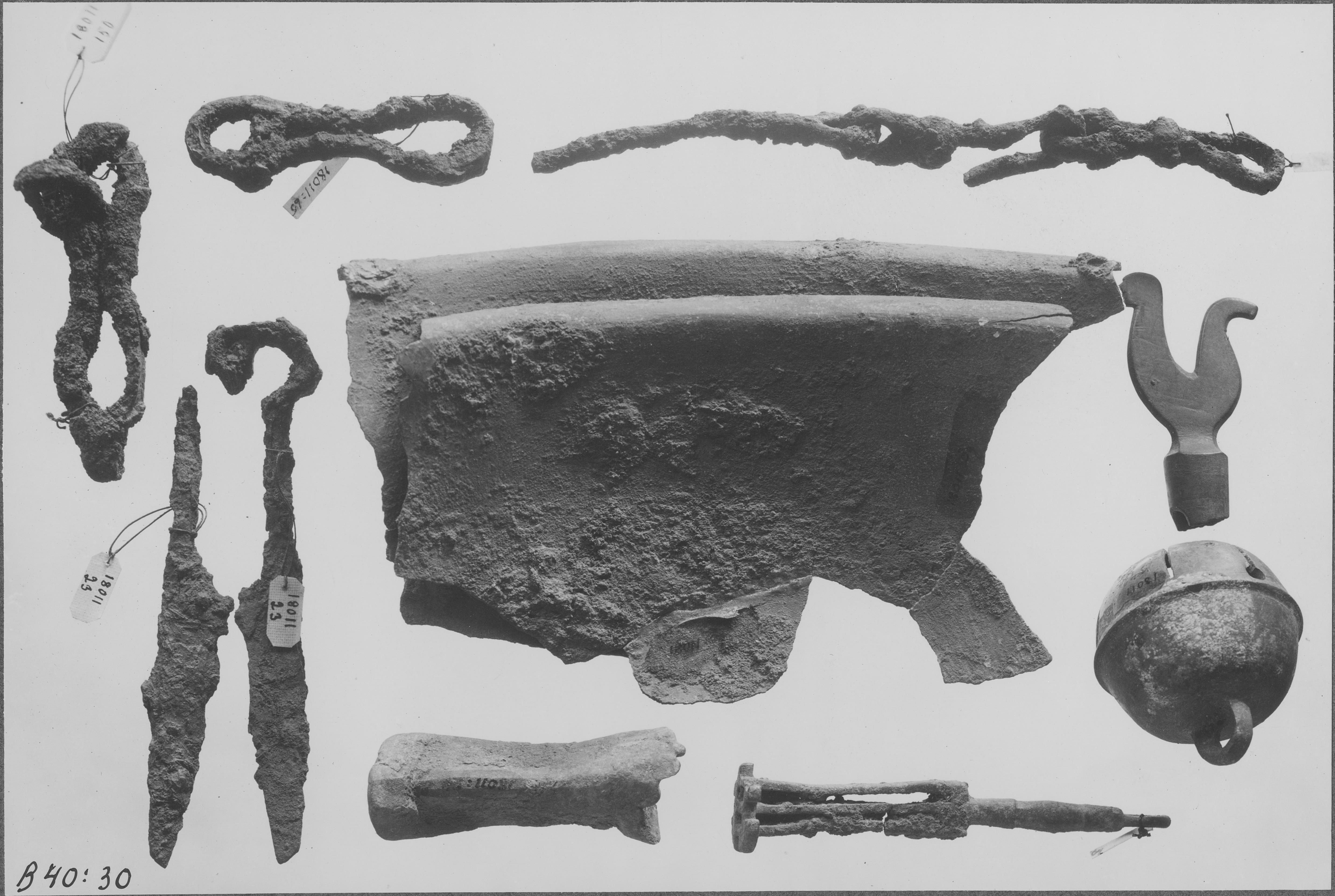 Beskrivning: Fårsax, kranvred, hästbjällra, öglor mm. SHM invnr 18011. Deposition i Vreta kloster.