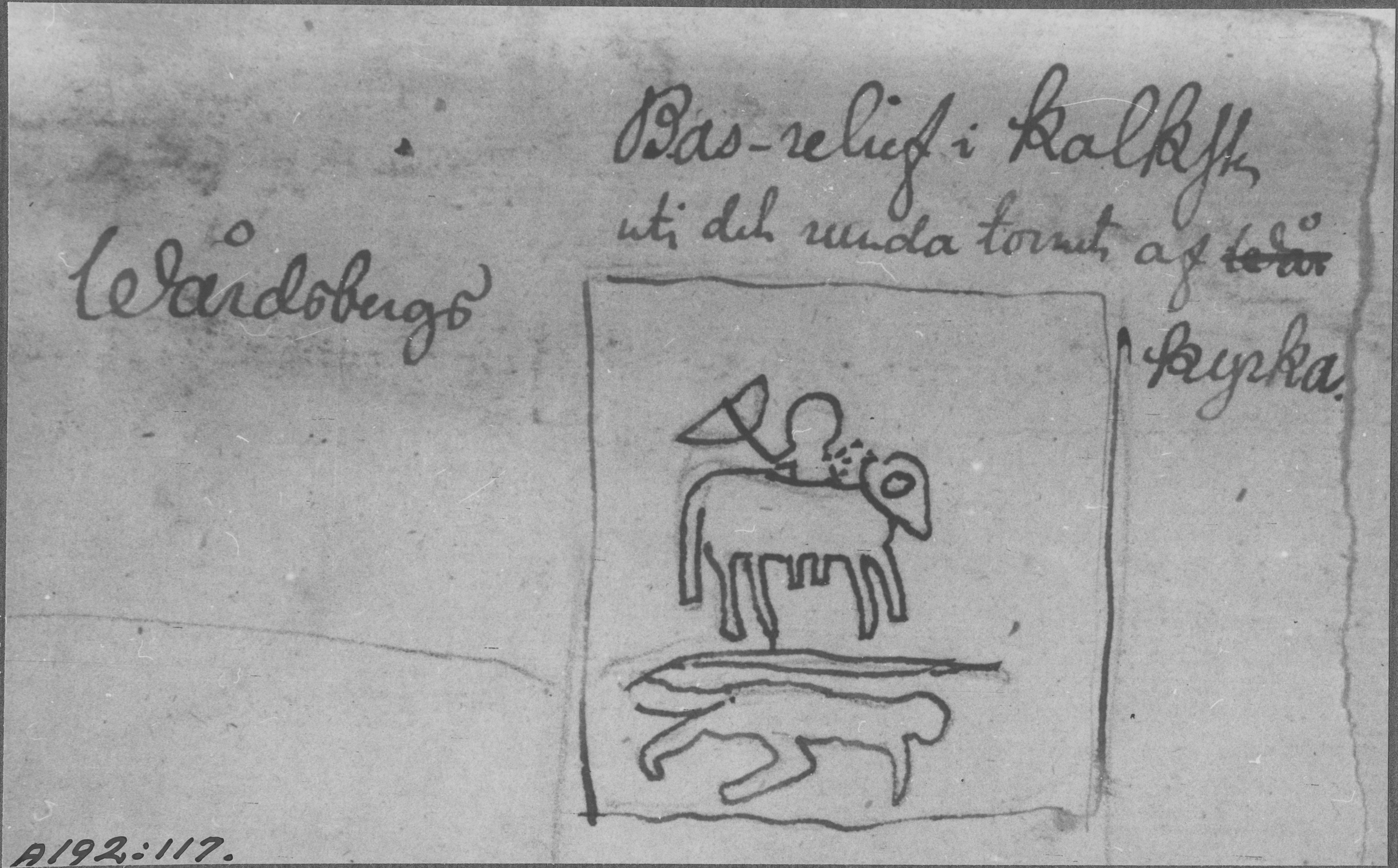 Beskrivning: Motiv med ryttare på fasaden, nu försvunnen. Teckning av Johan Haqvin Wallman i Nordiska museet.