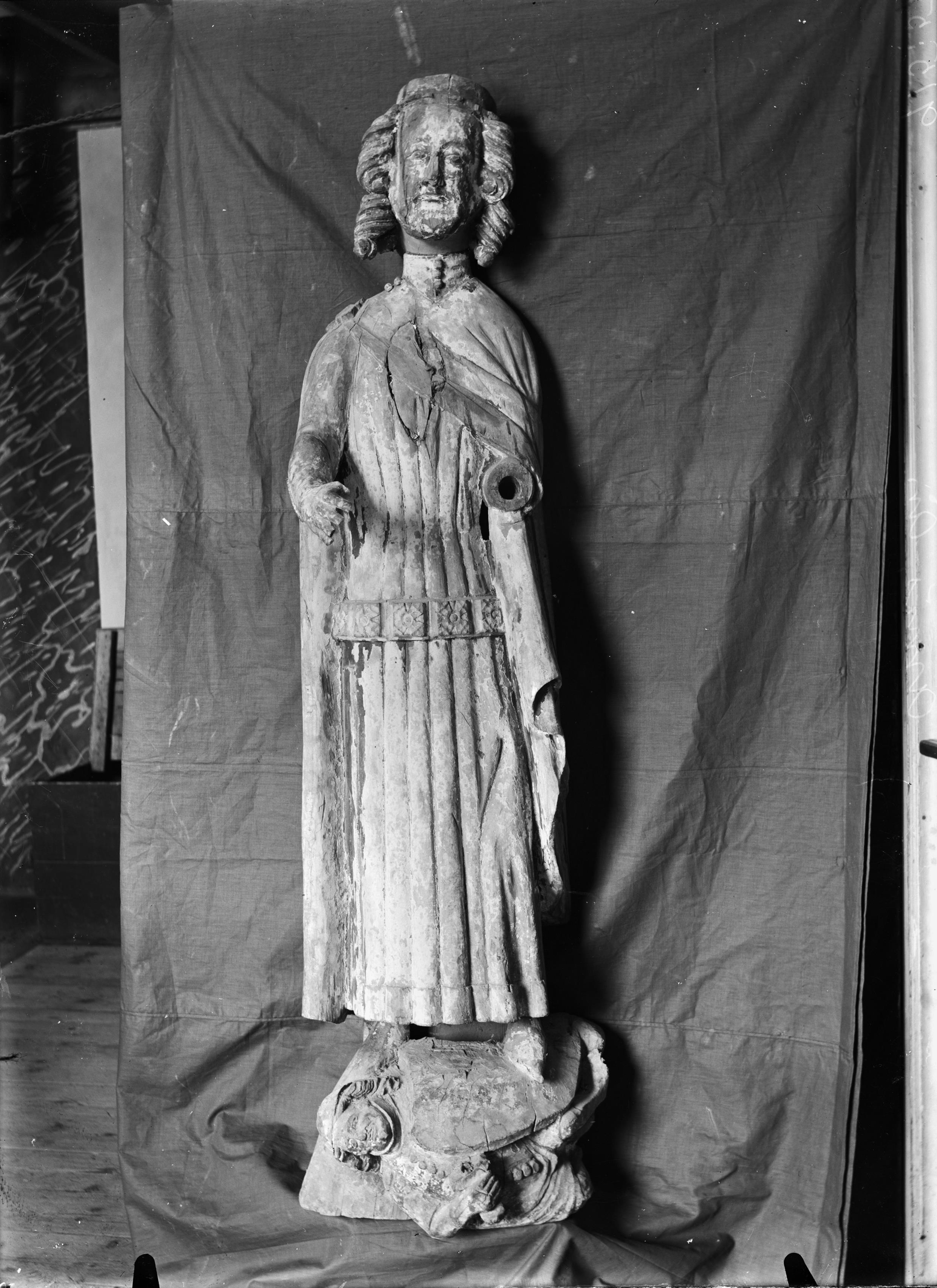 Beskrivning: Träskulptur, St Olov. Trampar på en liten man med sköld och svärd. 1500-talets början, snabbinv. Före konservering.