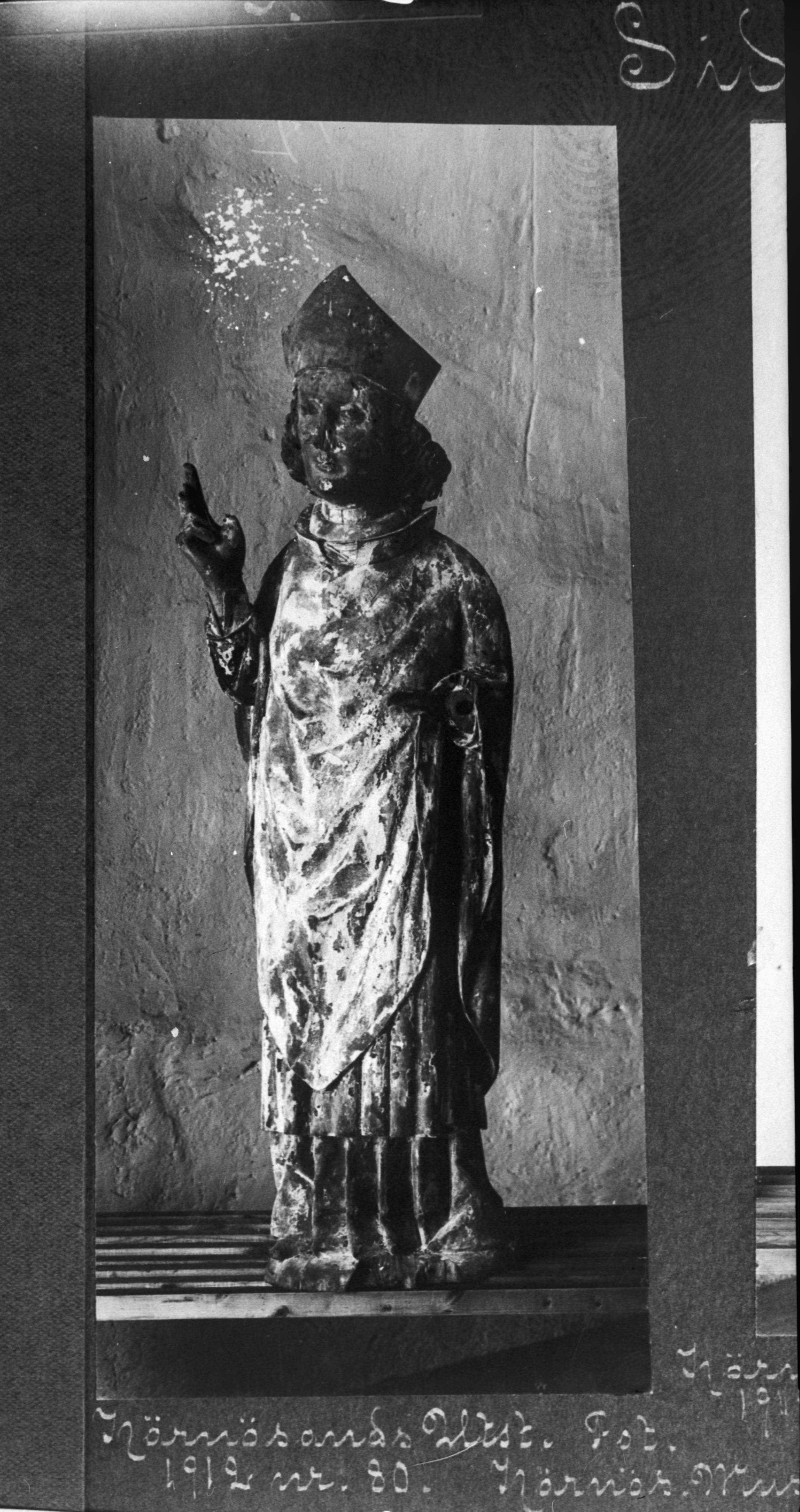 Beskrivning: Biskop. Träskulptur. H. 119 cm. Omkring 1500. Härnösandsutställningen 1912 nr. 80.