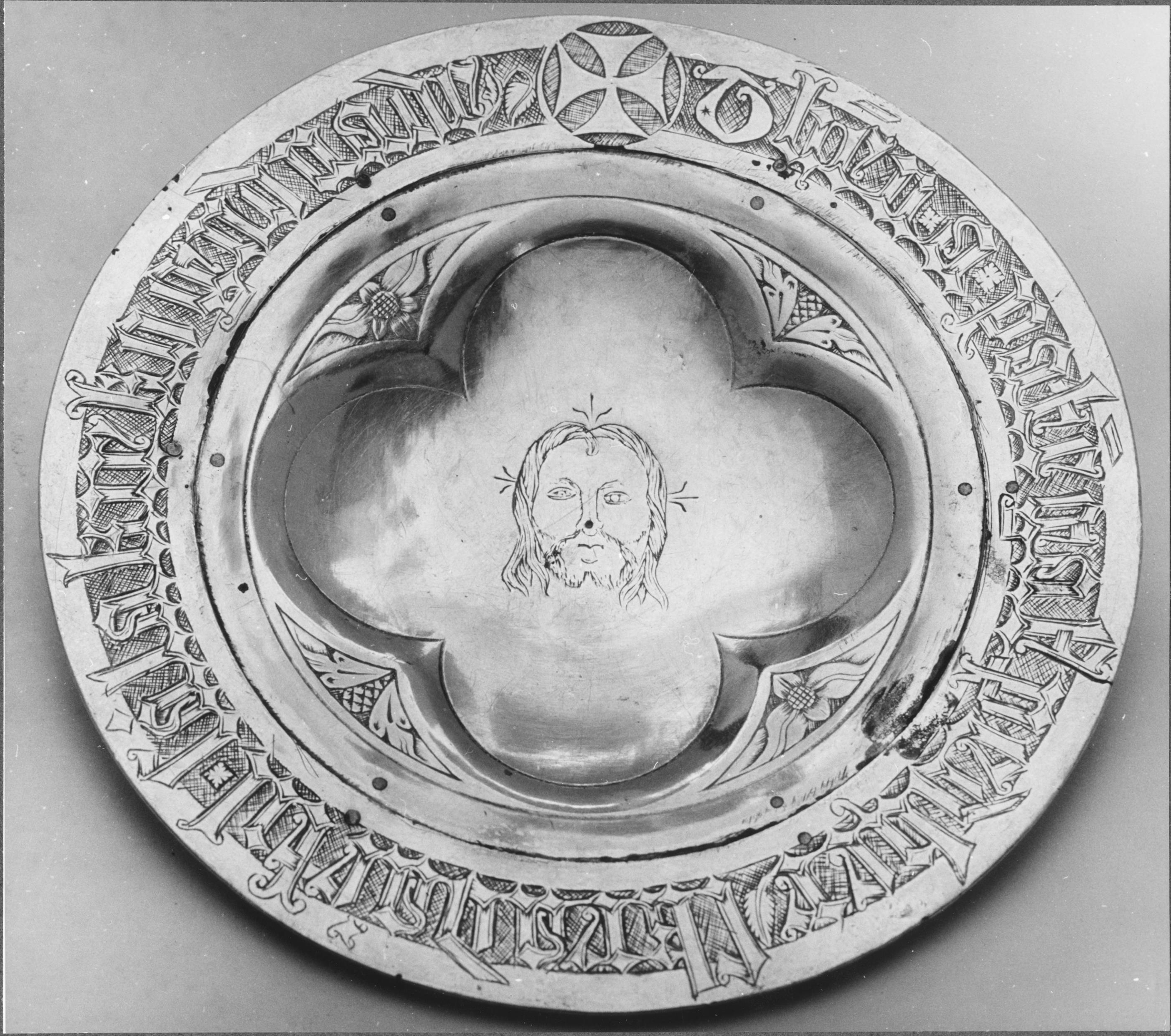 Beskrivning: Patén av silver, förgylld. I fördjupningen graverat Kristushuvud. I svicklarna blommor. På kanten inskrift med minuskler. Diam. 14,7 cm. 1400-talet.