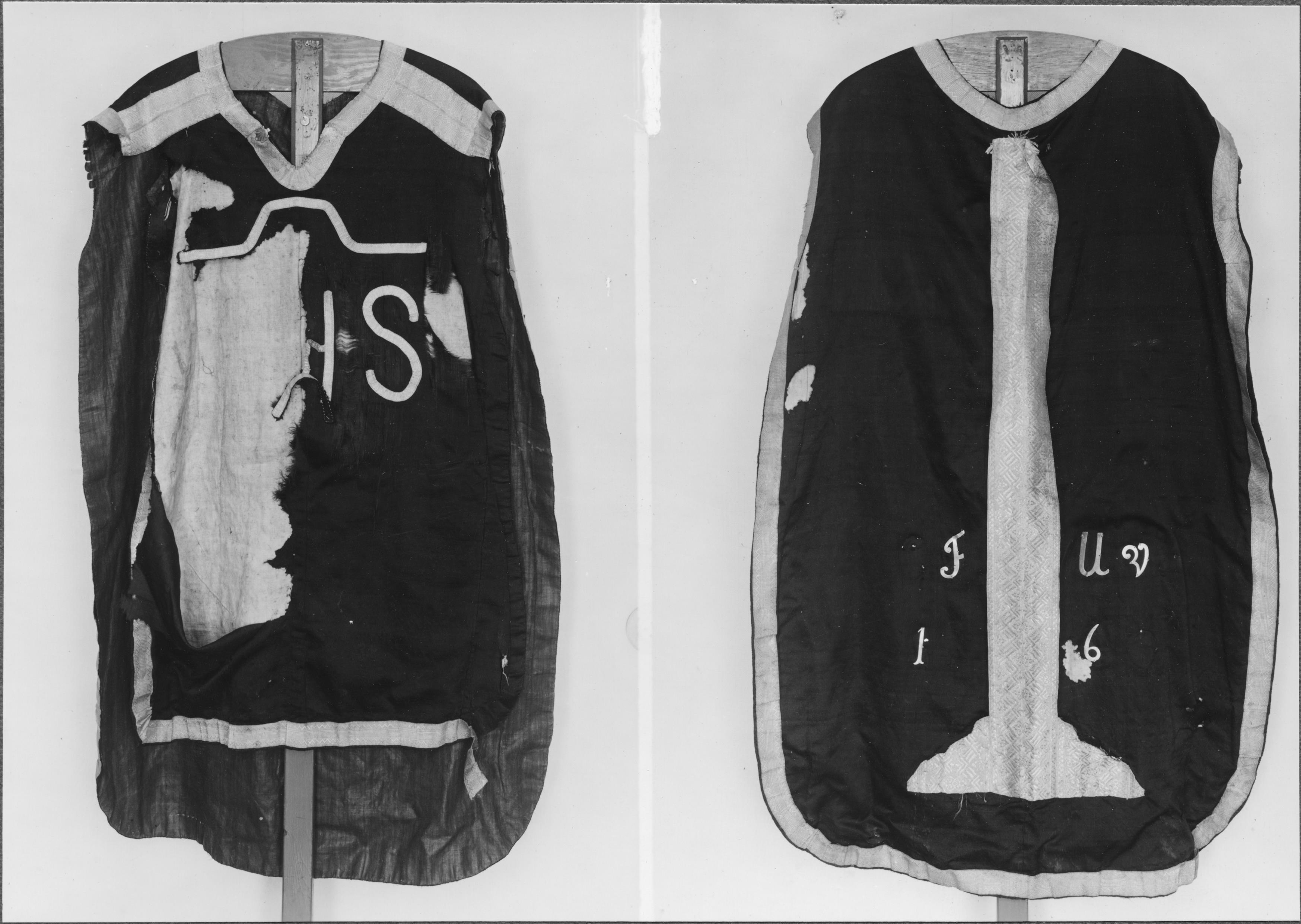 Beskrivning: Mässhake av svartbrunt siden. På bröststycket IHS av silverband. På ryggstycket kors av silverband och inskrift med silverplåtar. Före konservering hos Libraria.