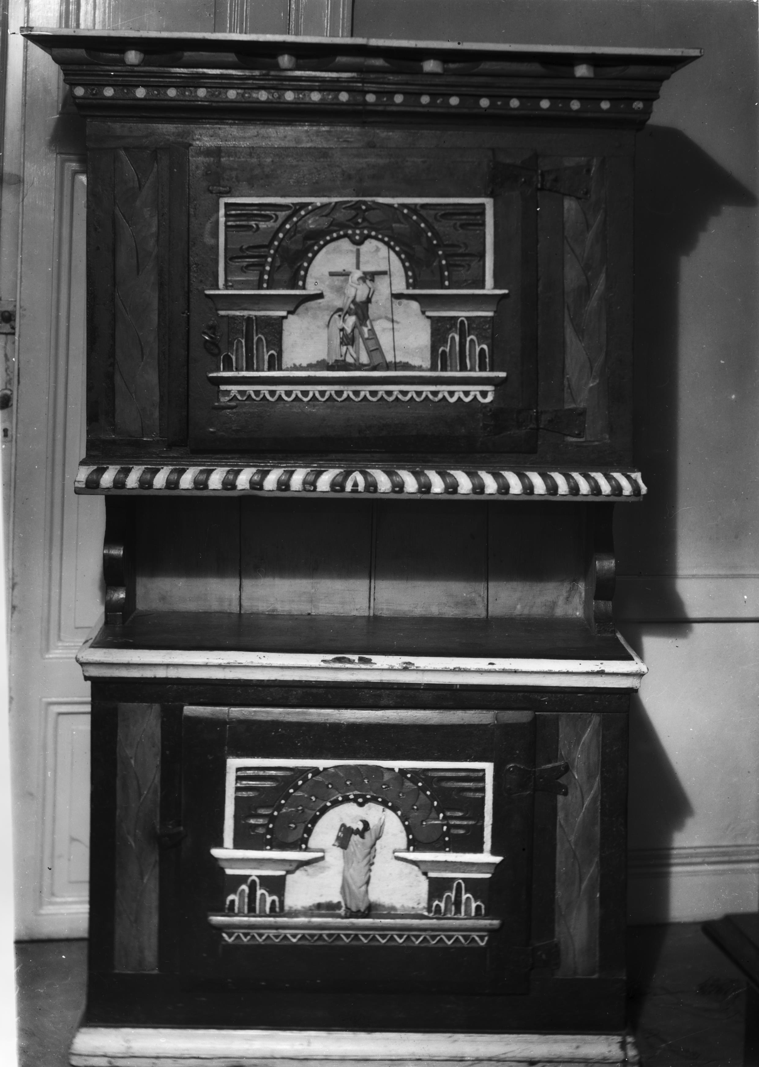 Beskrivning: Skåp, av trä. Religiöst motiv i relief på skåpdörrarna.