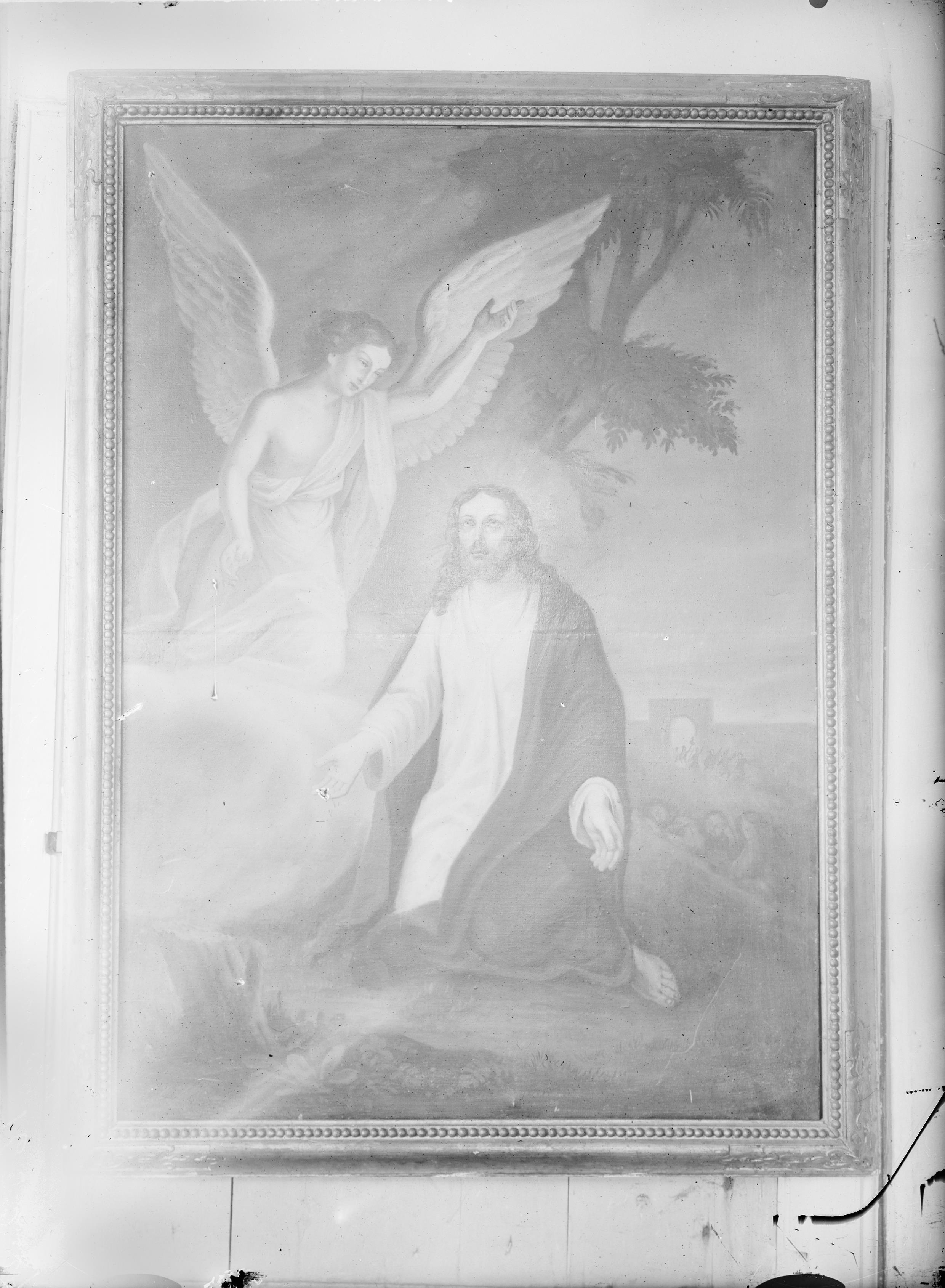 Beskrivning: Oljemålning på duk. Kristus i Getsemane. Förgylld ram med pärlstav och blad. 1800-talet. Snabbinventering.