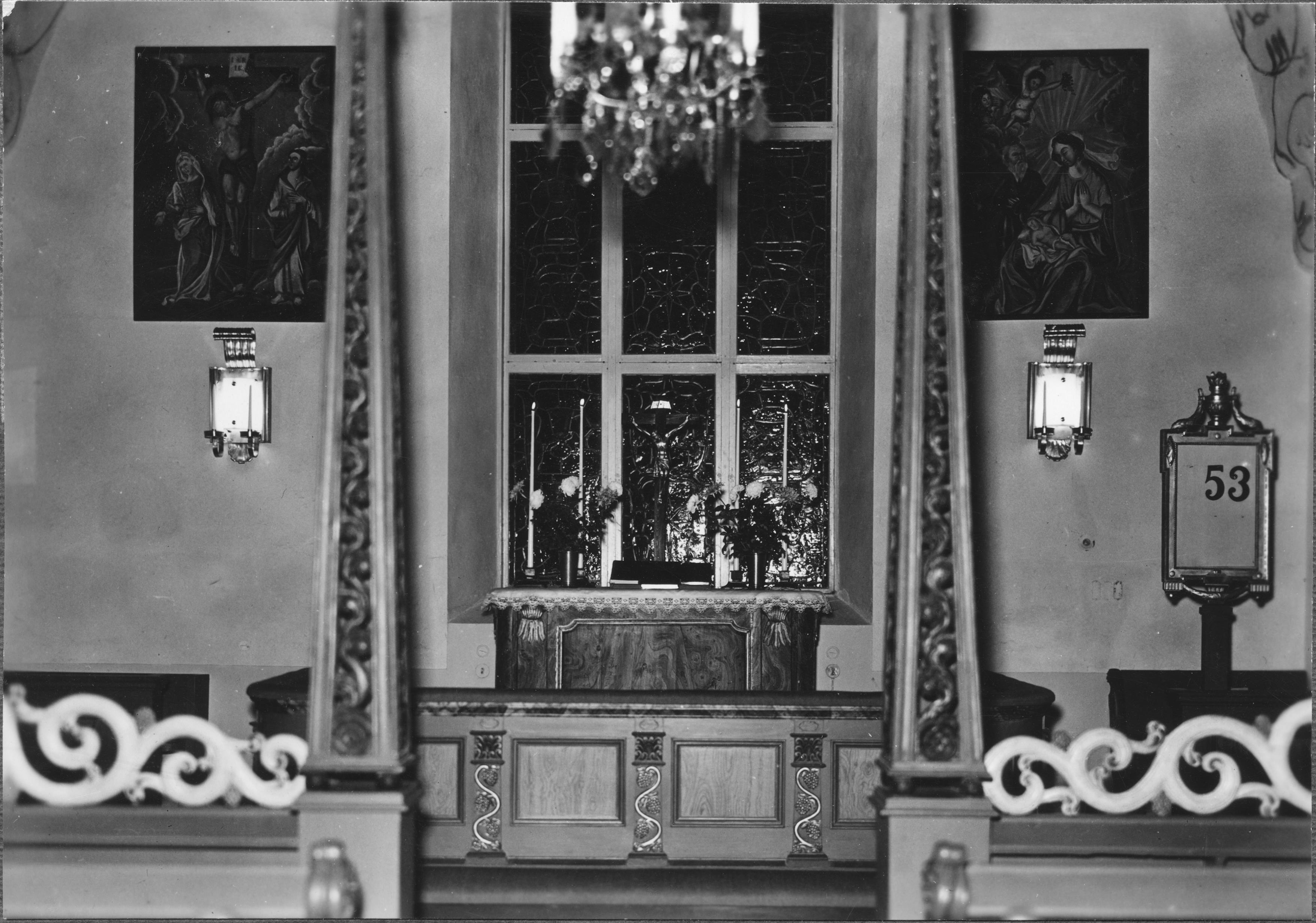 Beskrivning: Altaret. Altarbord med grön marmorering och förgyllda musselornament. 1700-talet, snabbinv.
