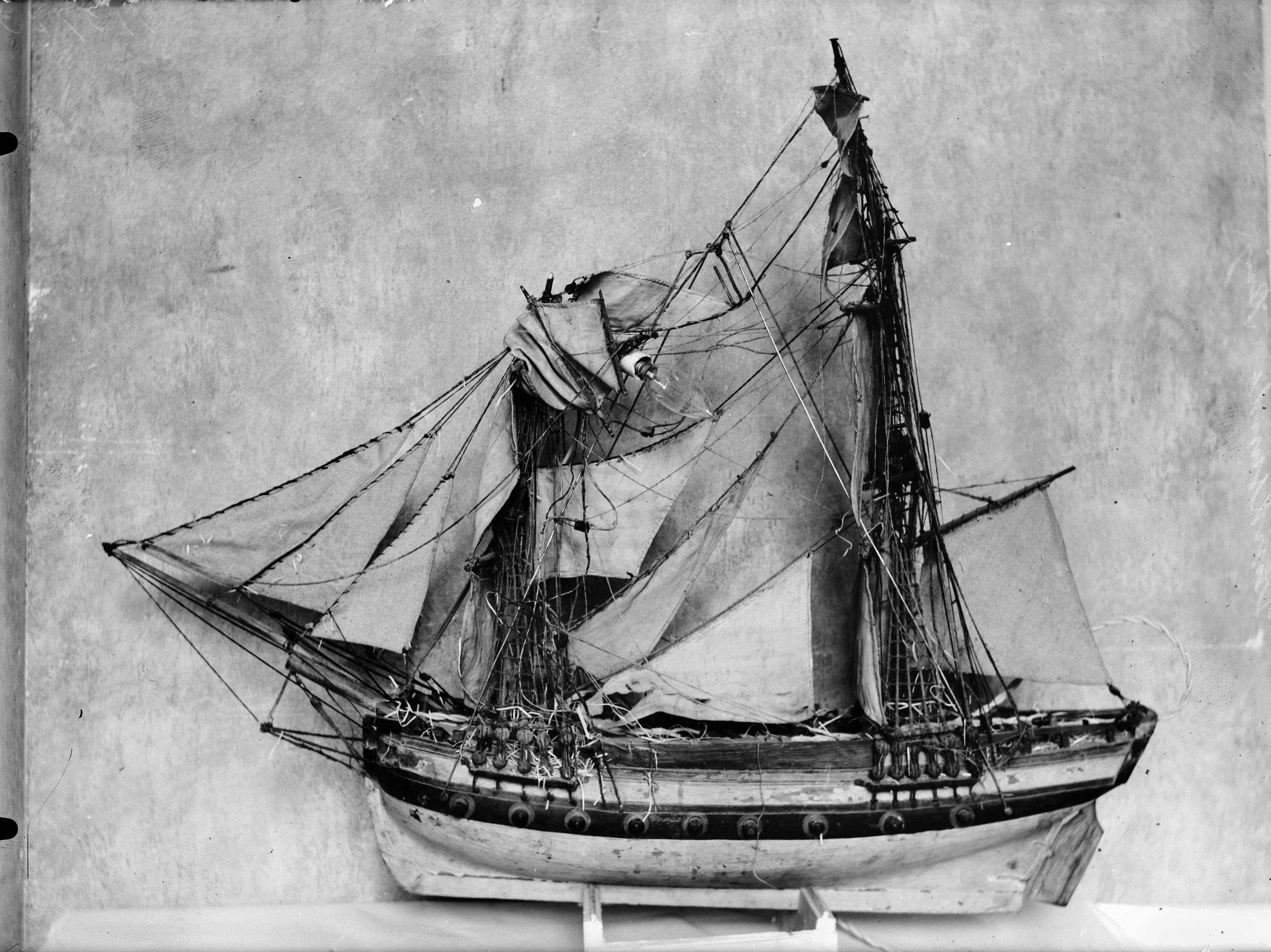 Beskrivning: Votivskepp, av trä. Två master med segel. Bestyckad med kanoner. 1600-talet, snabbinv. Före konservering.