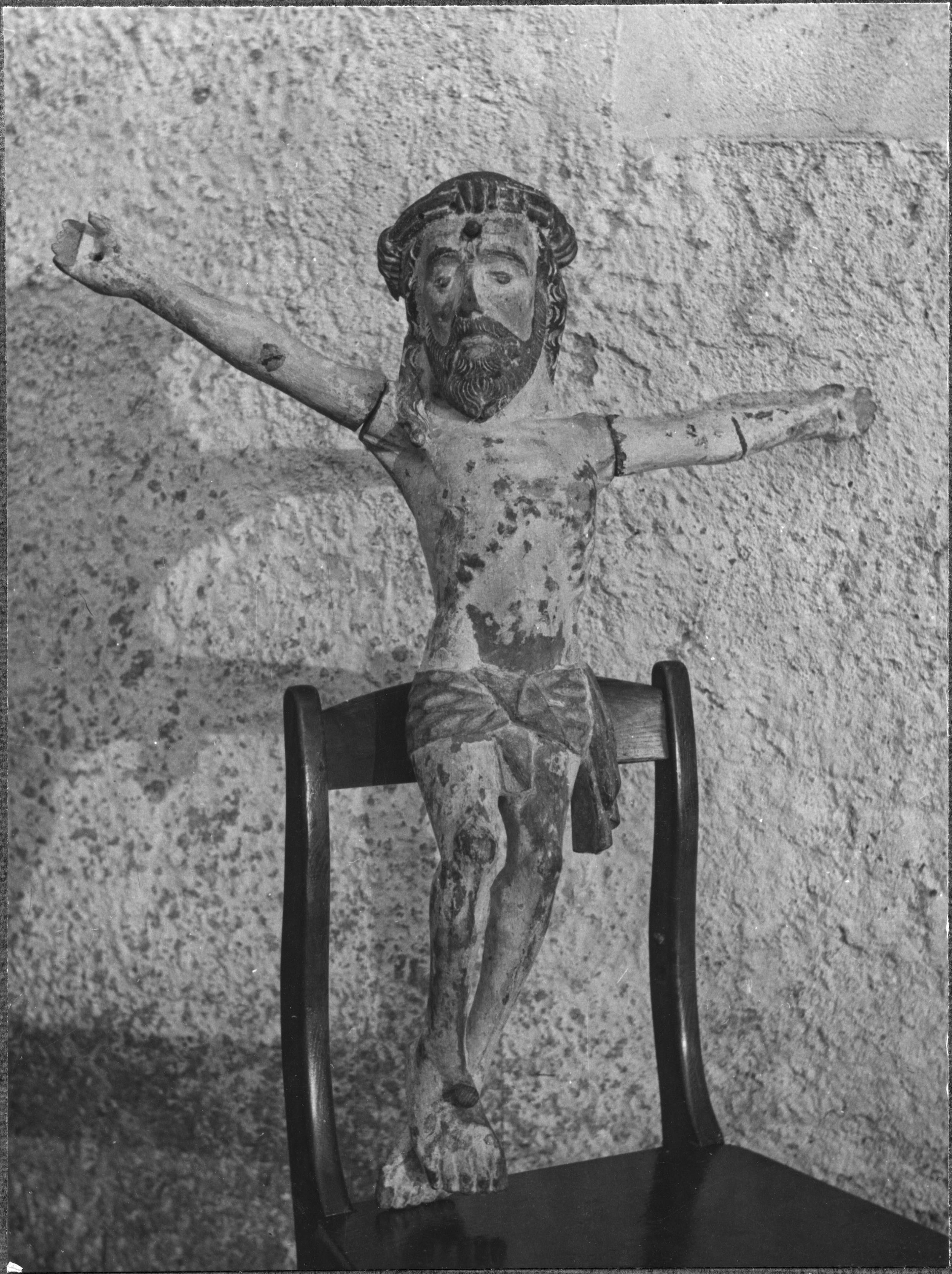 Beskrivning: Kristusfigur från medeltida krucifix där korset saknas.