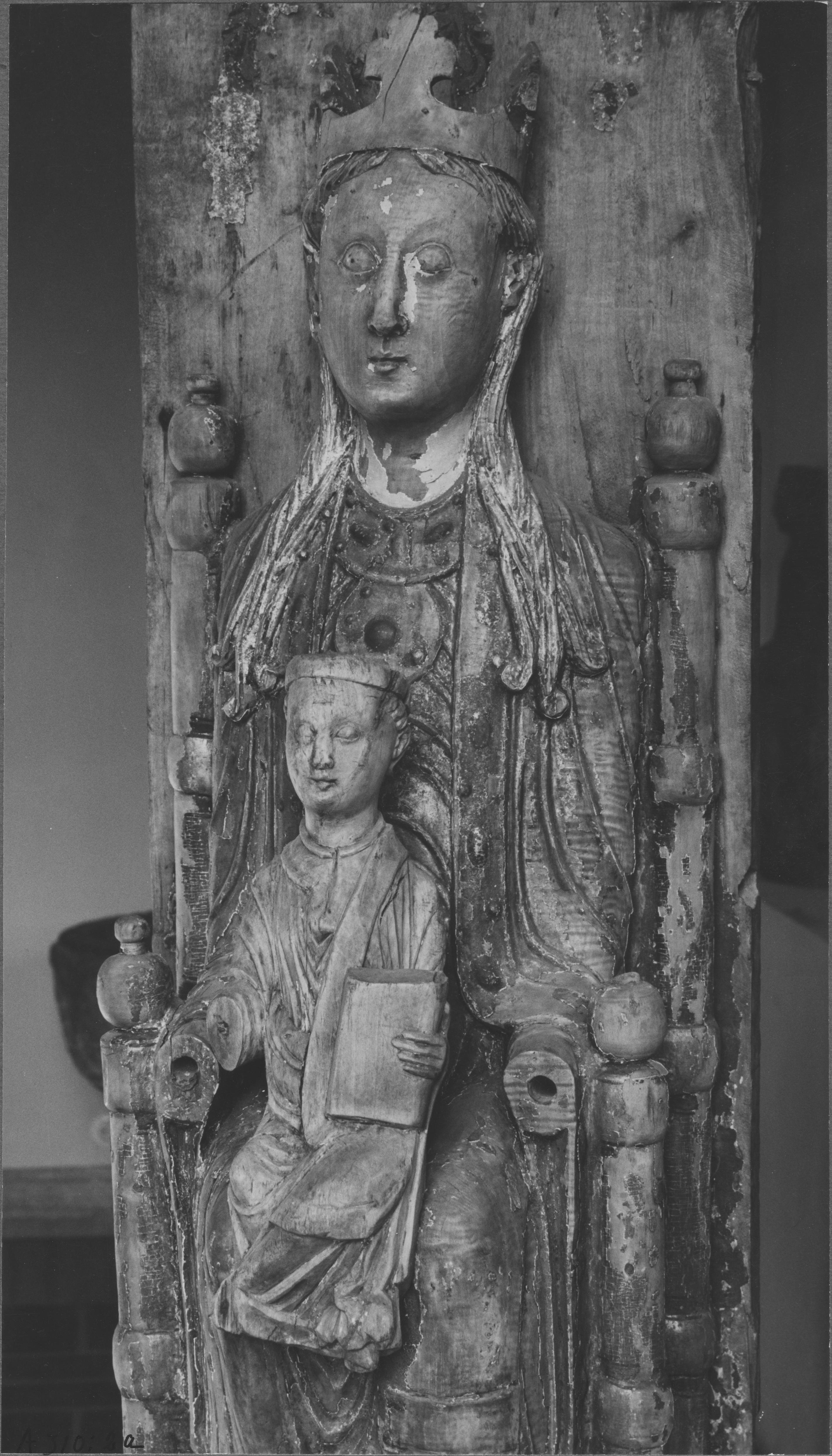 Beskrivning: Träskulptur föreställande Madonnan och barnet, detalj.