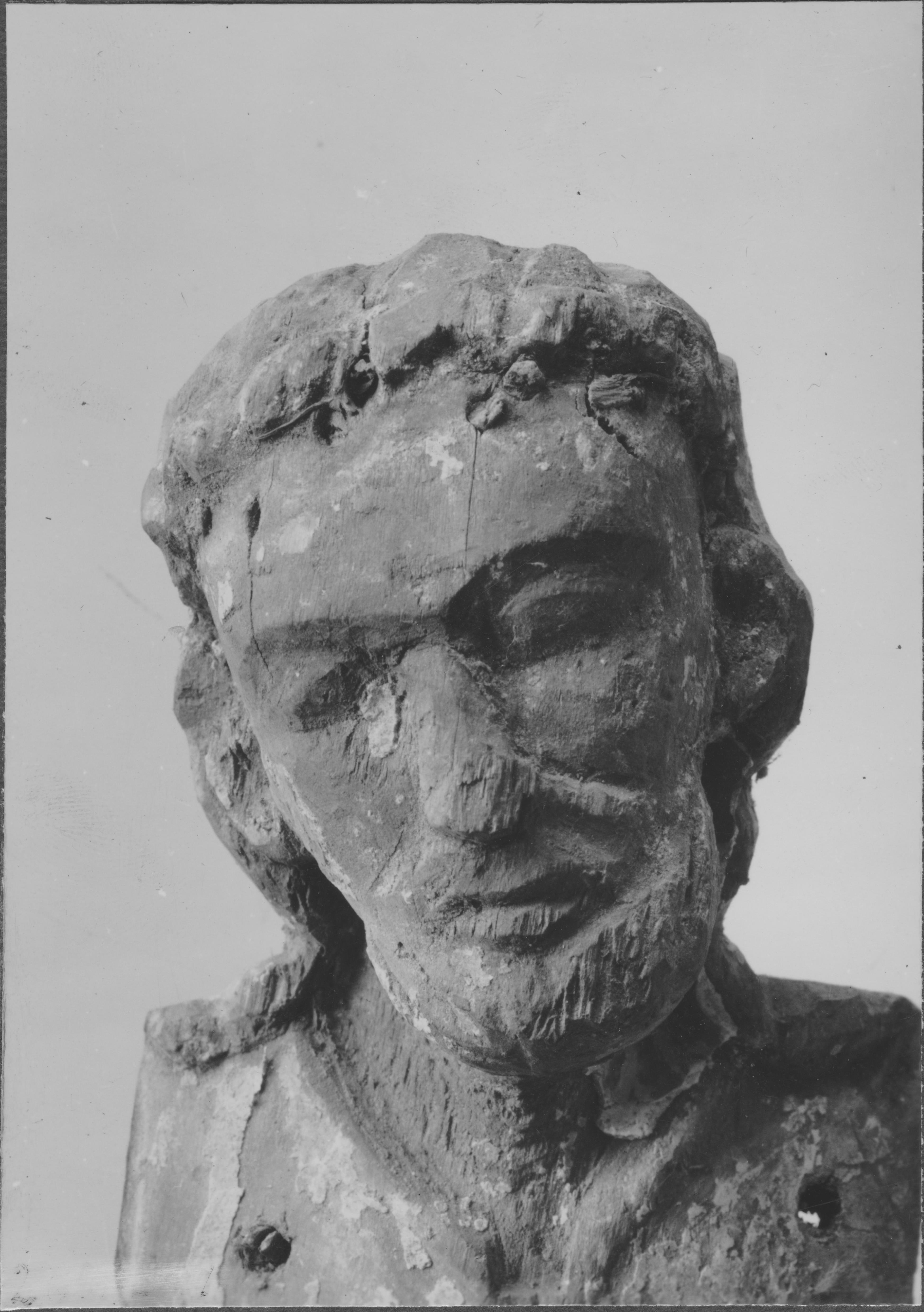 Beskrivning: Del av krucifix av trä.1600-talet. Efter restaureringen 1956.
