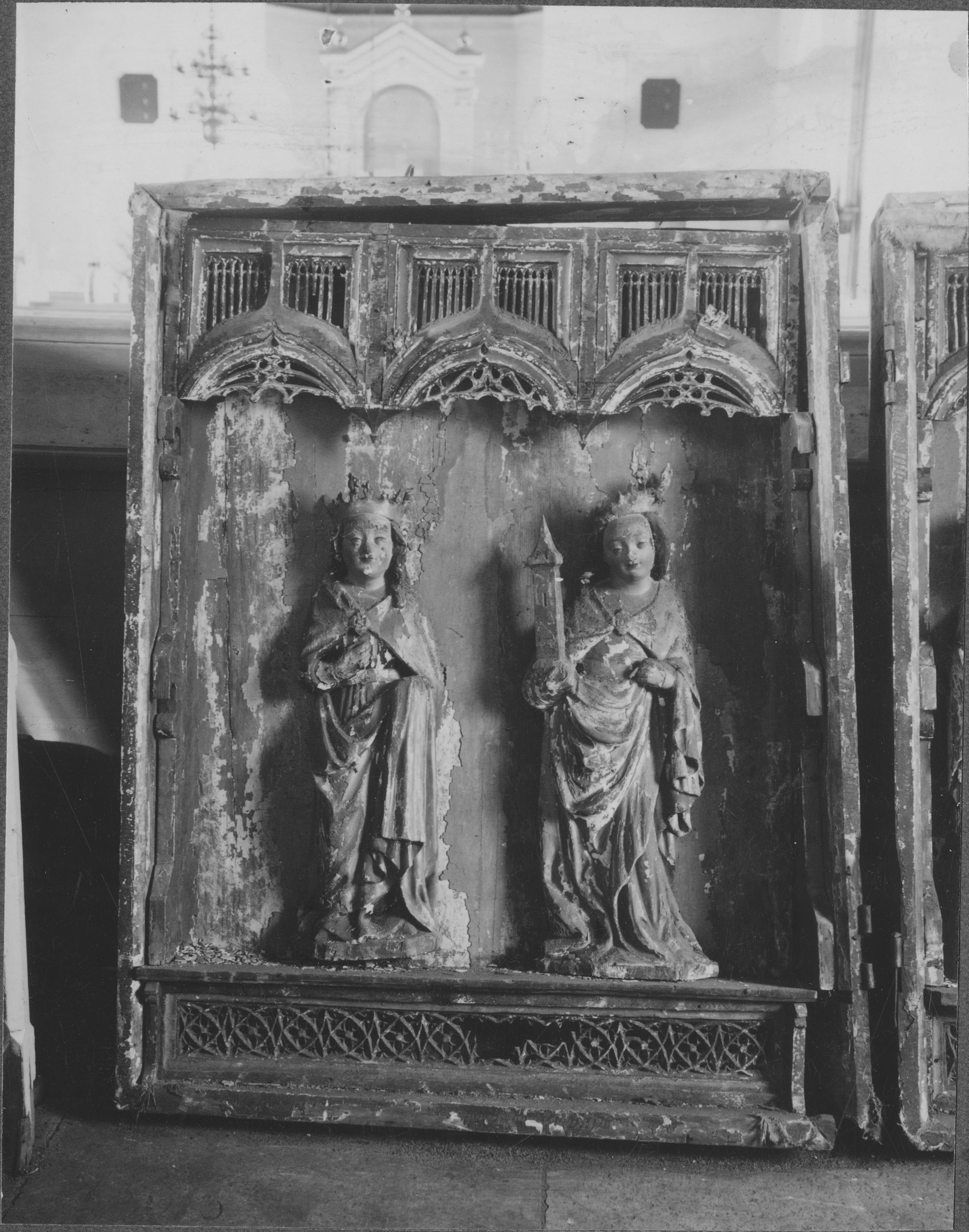 Beskrivning: Altarskåp av skulpterat, målat och förgyllt trä, detalj, flygel. Färgen, baldakin- och gallerverk något skadade. 1400-talet. Återlämnat till kyrkan 1949.