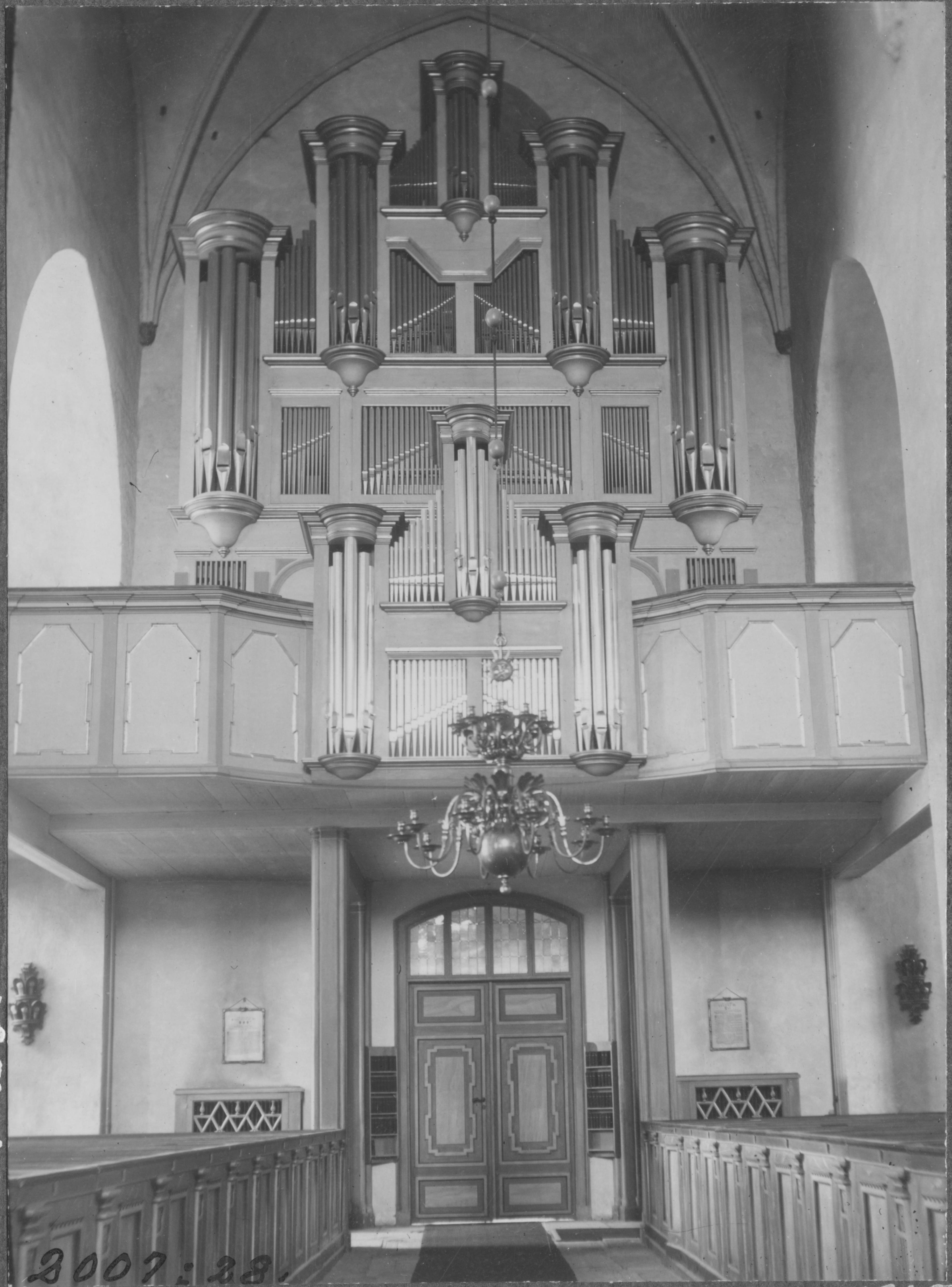 Beskrivning: Orgel av Wahlberg och Wåhlander 1772. Orgelns gamla fasad med nya ryggpositivet.