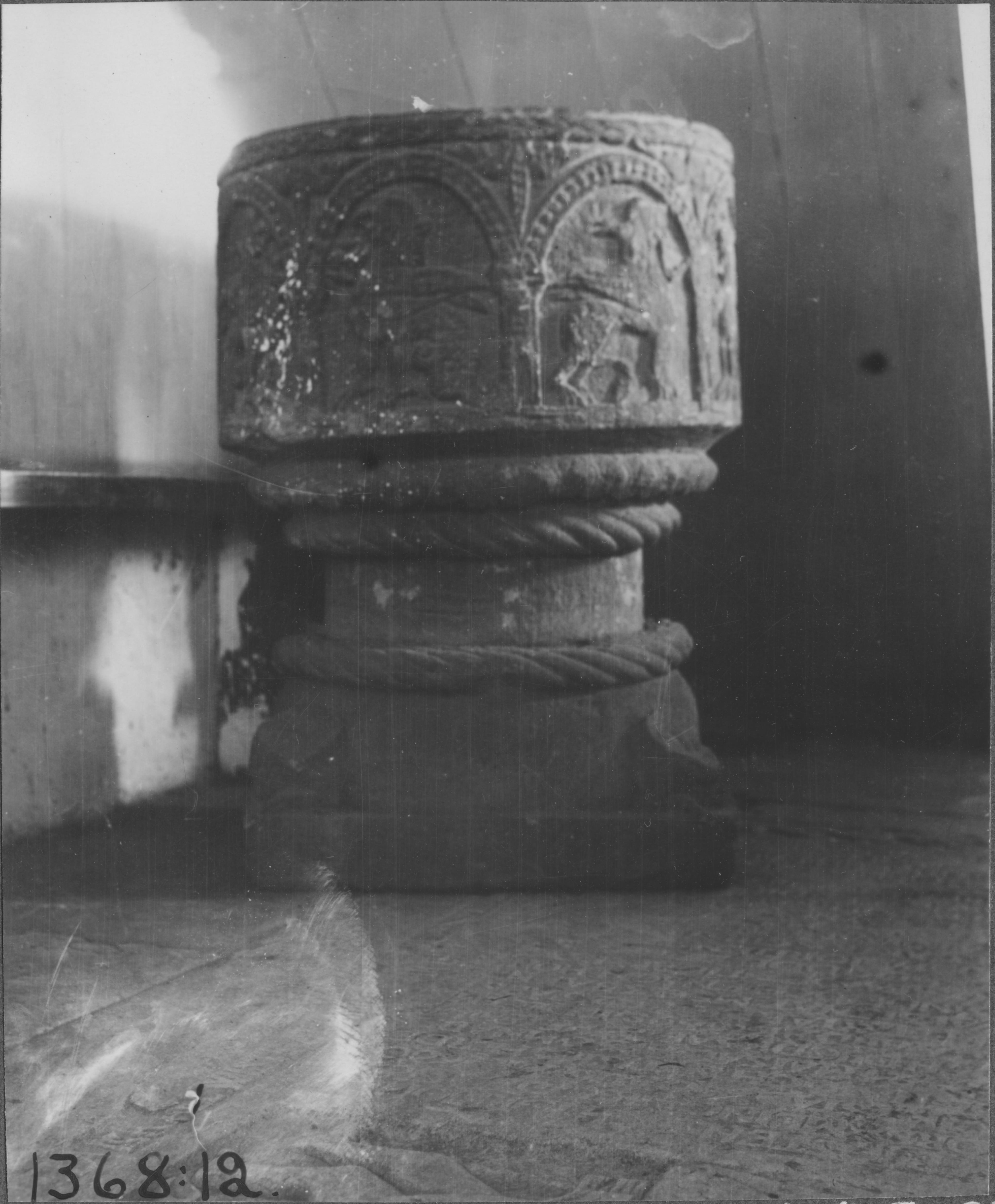 Beskrivning: Dopfunt av sandsten. Cylindrisk cuppa och cylindriskt skaft med repstavar. Åtta arkadbågar med djurfigurer i fälten. 1200-talet. Snabbinventering.
