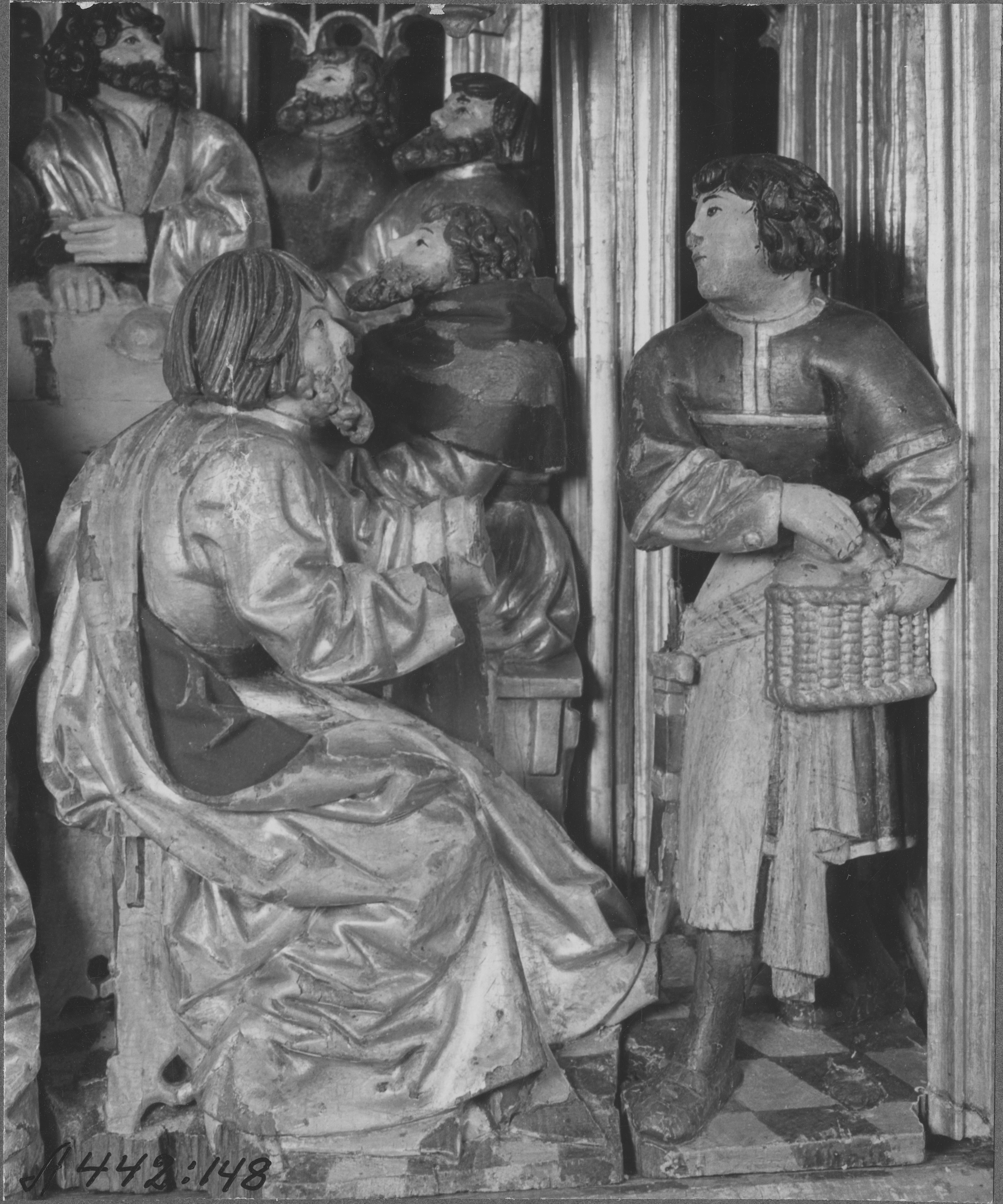 Beskrivning: Altarskåp av ek. Tillverkad i Brysselverkstad. Från 1500-talets första fjärdedel. Detalj, Nattvarden.