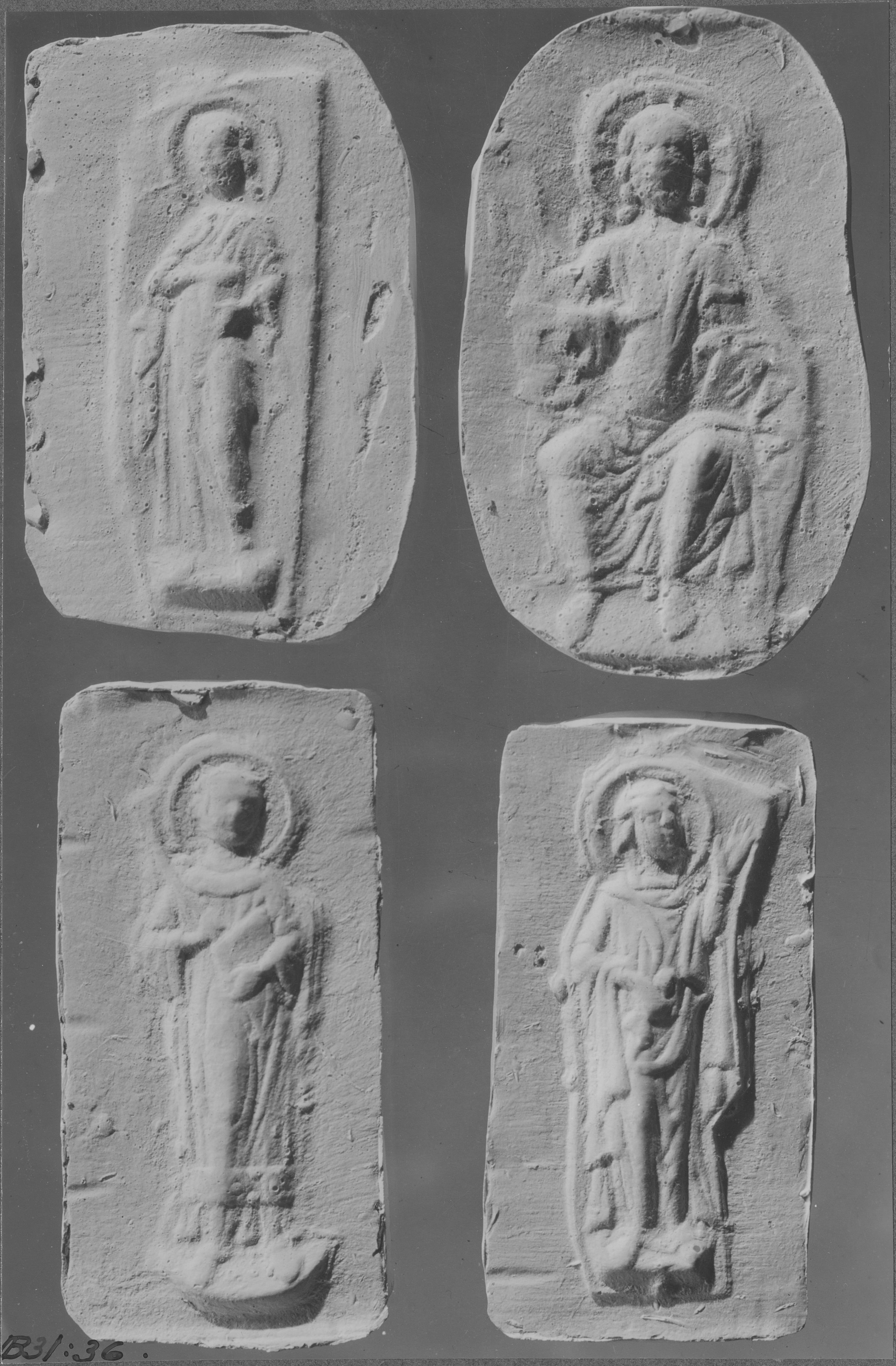 Beskrivning: Avgjutningar av reliefer på storklockan, troligen från 1200-talet. Visar bl a tronande Kristus och apostlar.